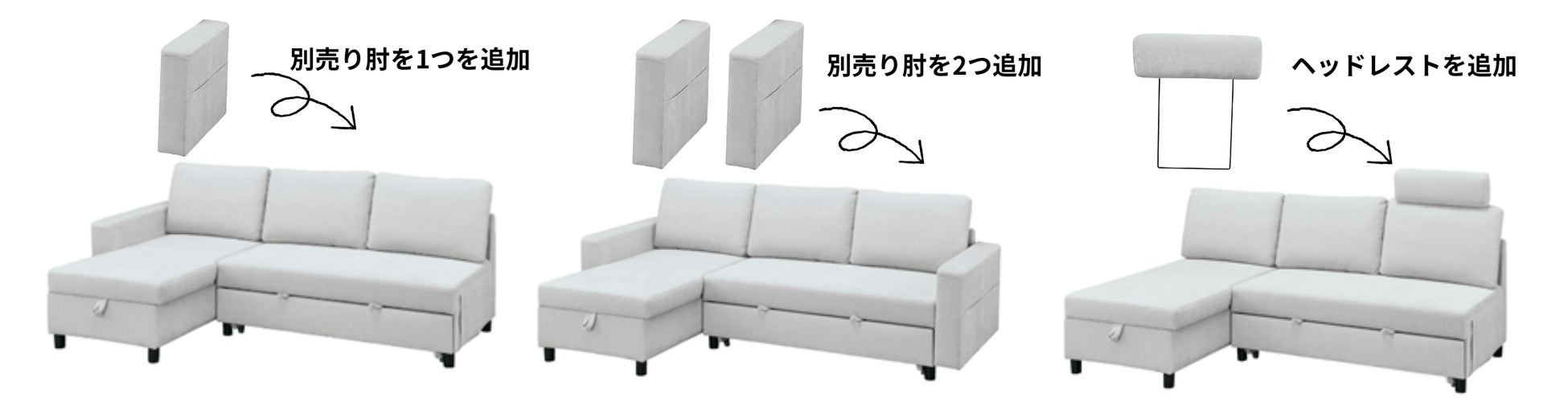 さらに快適にお使いいただくため、「別売り肘」と「ヘッドレスト」もラインアップ。お客様のライフスタイルに合わせて、組み合わせていただけます。
