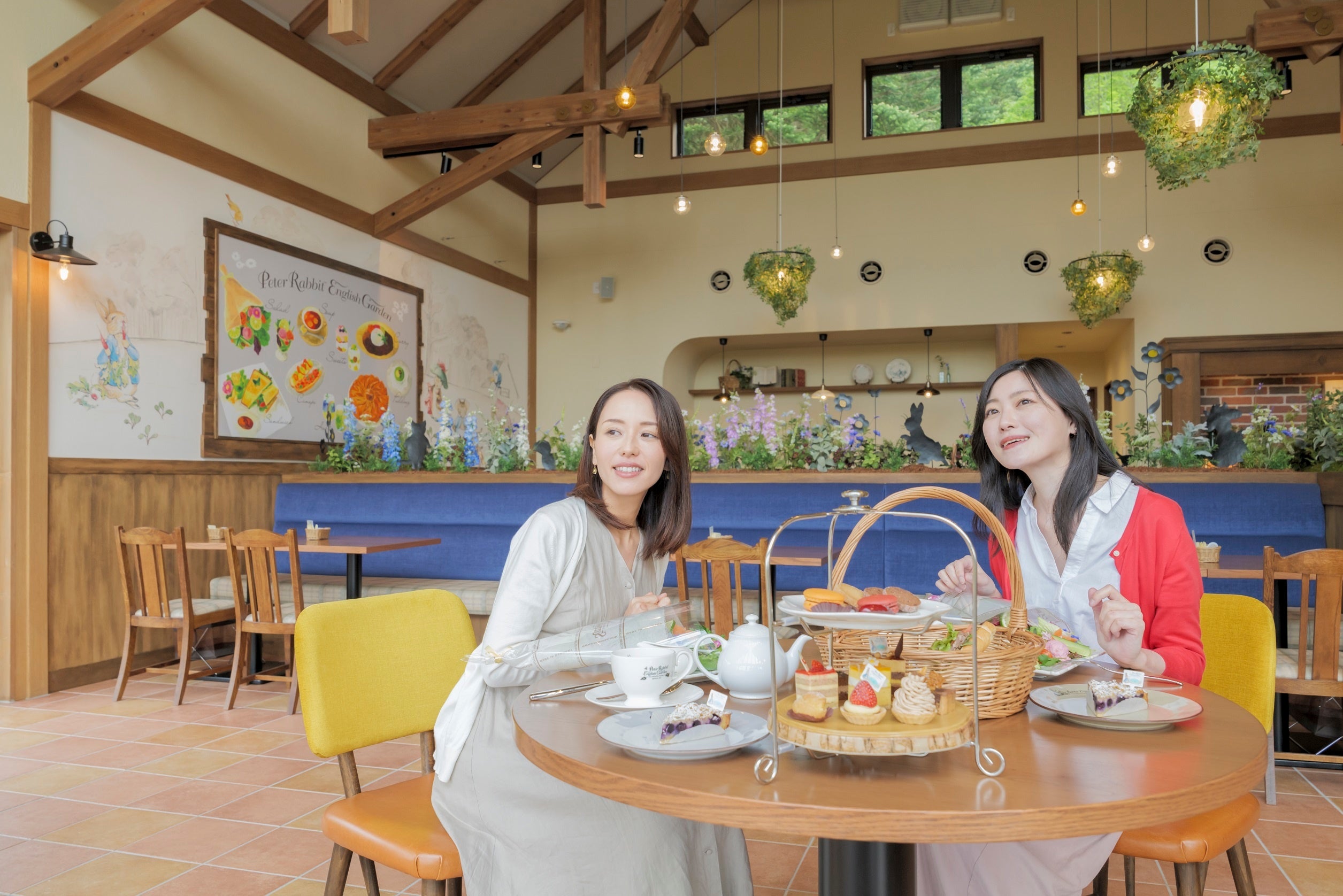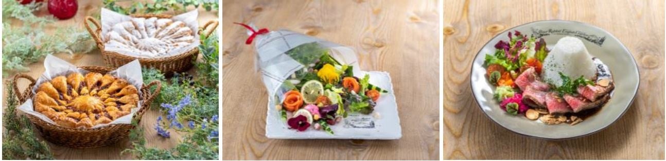 庭園の雰囲気や英国らしさを体感しながらゆったりとしたひと時をお過ごしいただけるカフェでは、絵本に出てくるパイとデイジーのお花をモチーフにした「ブルームパイ」をはじめ、色とりどりの野菜やスモークサーモンを花束のように盛りつけた「マグレガーおじさんのとれたて野菜のブーケサラダ」、ローストビーフと富士山型のライスを盛りつけた「彩りローストビーフプレート」、ドライフラワーを浮かべた「フラワリーラテ」といったオリジナルメニューのほか、サクサク食感のシュークリームやパンなどのテイクアウト商品も豊富に取り揃えております。