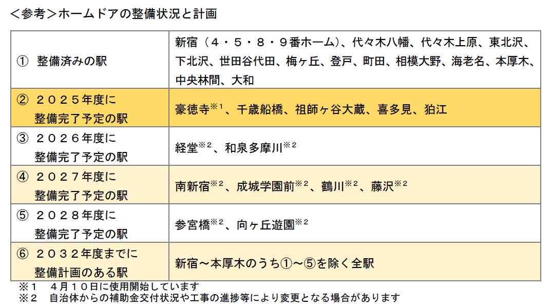 お客さまのホームからの転落や列車との接触事故を防止するために「鉄道駅バリアフリー料金制度」や東京都の「ホームドア整備加速緊急対策事業」による補助金などを活用して、豪徳寺駅、千歳船橋駅、祖師ヶ谷大蔵駅、喜多見駅、狛江駅の全10ホームで、今年度中にホームドアを使用開始します。