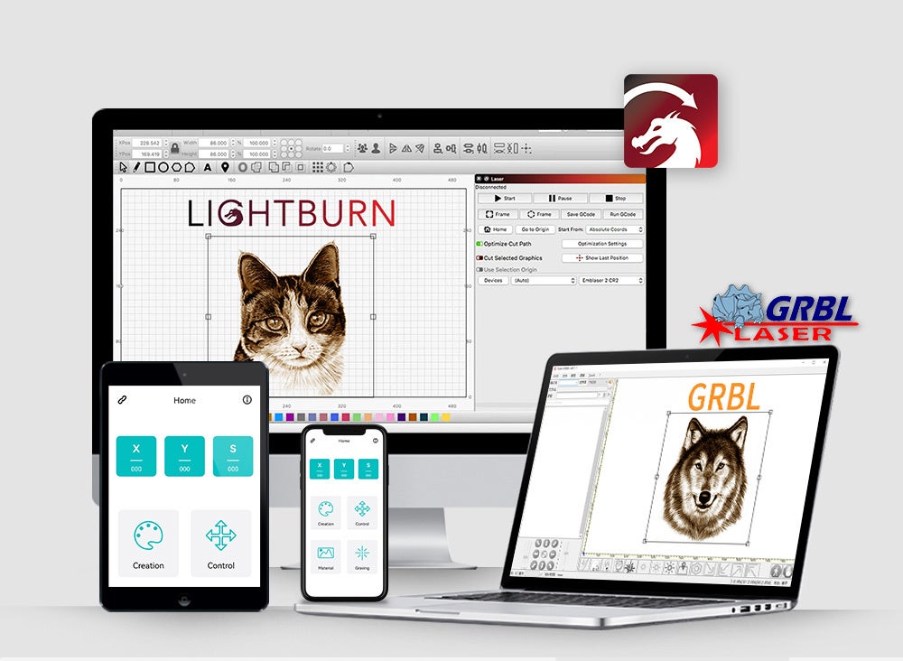 LaserGRBLはWindowsにのみ対応、LIGHTBURNはWindows /Macに対応しています。