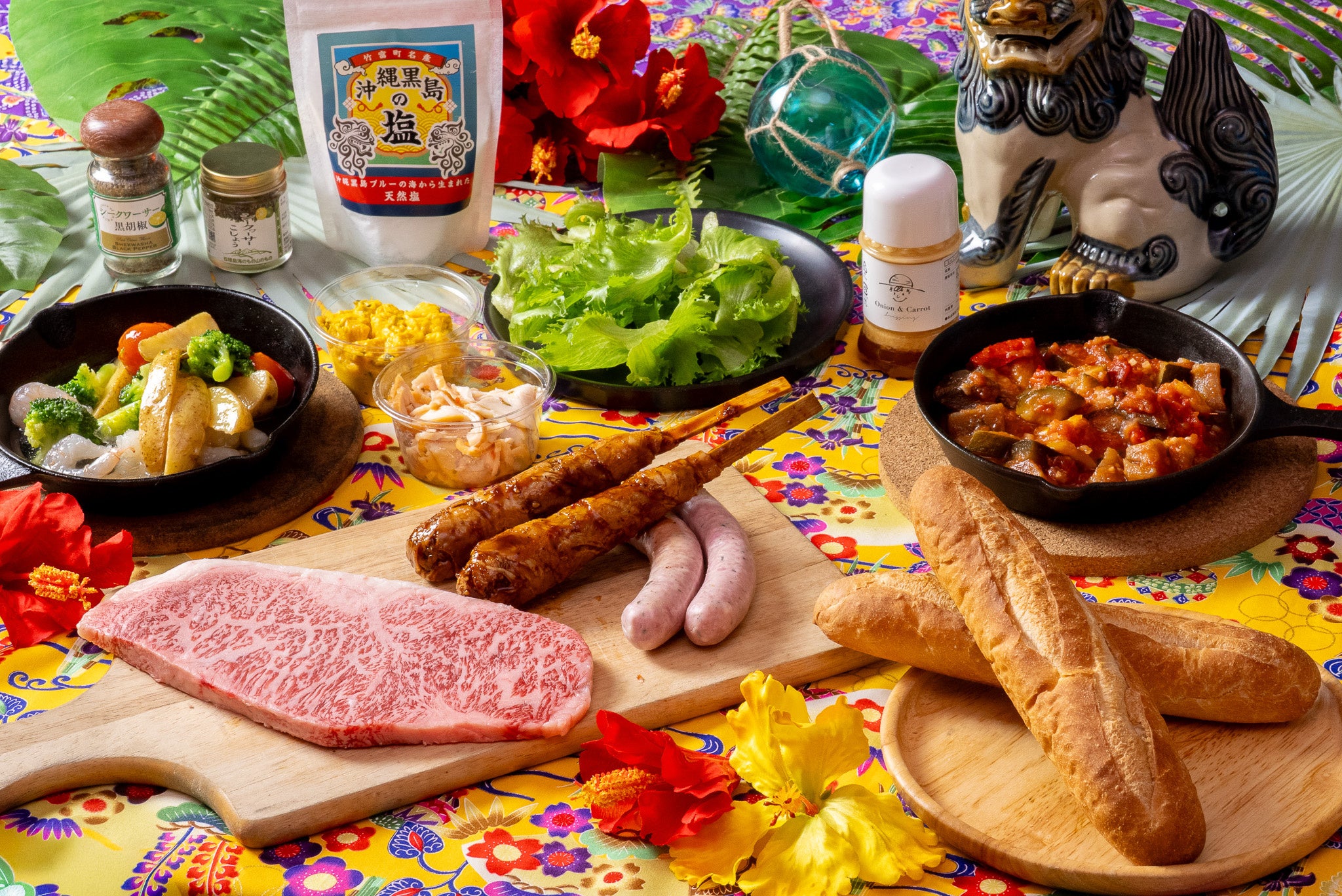 通常の宿泊BBQプランの牛ステーキを石垣牛へ変更して提供。こだわりの3種の調味料(石垣の塩、シークワーサー黒胡椒、シークワーサー青唐辛子)をお好みで合わせてお楽しみください。
