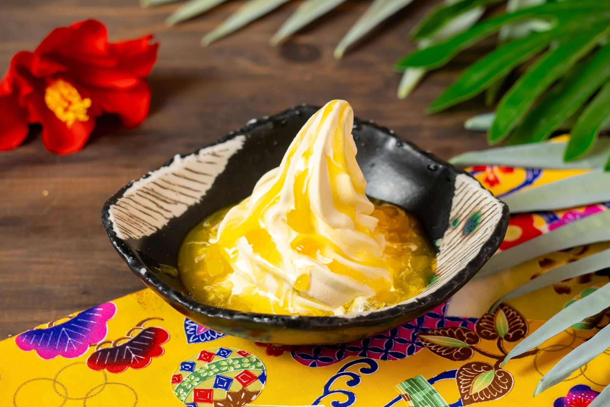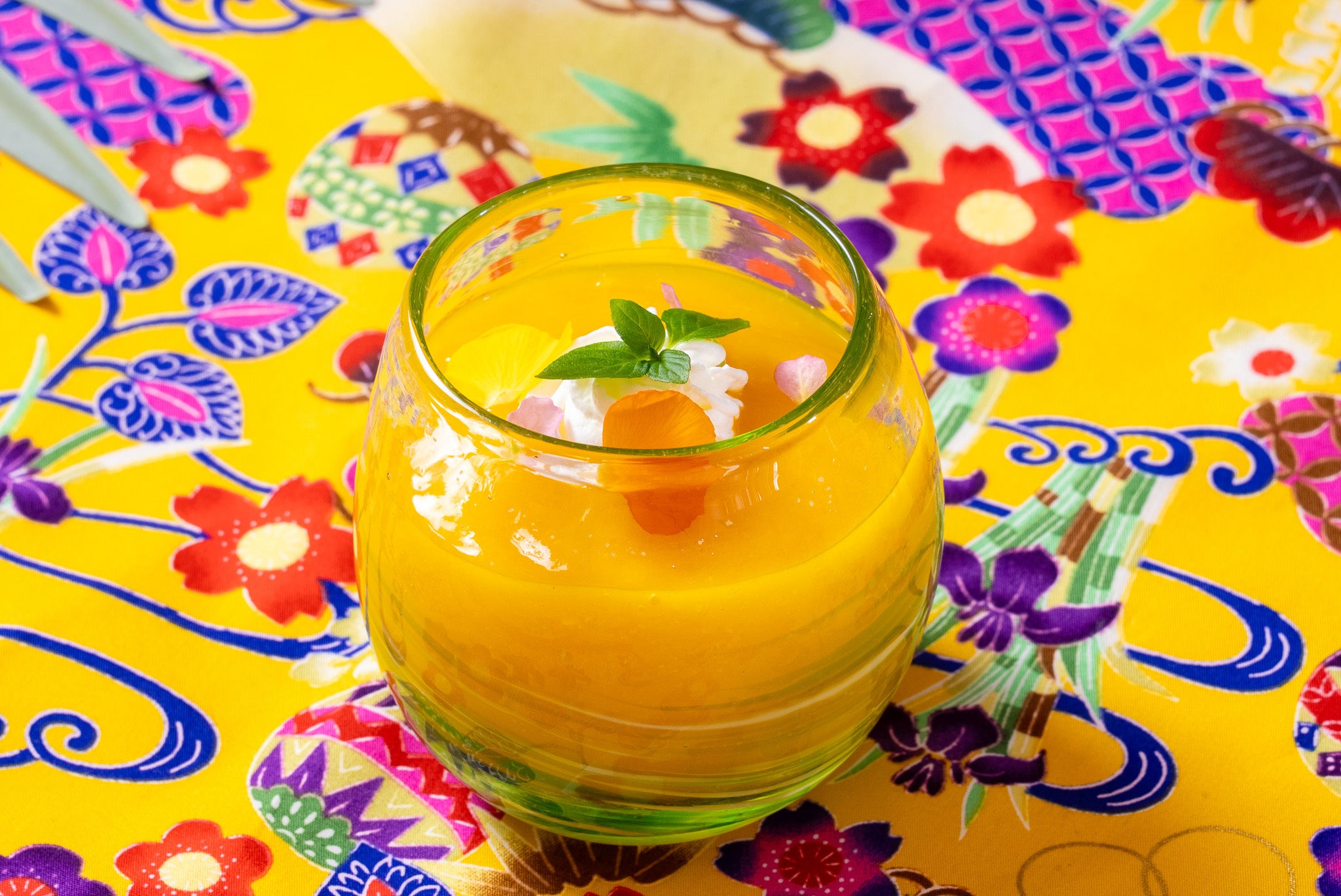 石垣島の川満農園の『ポトリ果マンゴー』を贅沢に使用したスイーツもご用意しました。樹上の果実を1つずつ包んだ袋の中に完熟したマンゴーが「ポトリ」。樹上で自然落下したマンゴーは、すでに完熟なので一般市場や量販店に並べることができず、産地直送でしかお目に掛かれない正真正銘の貴重な完熟マンゴーです。