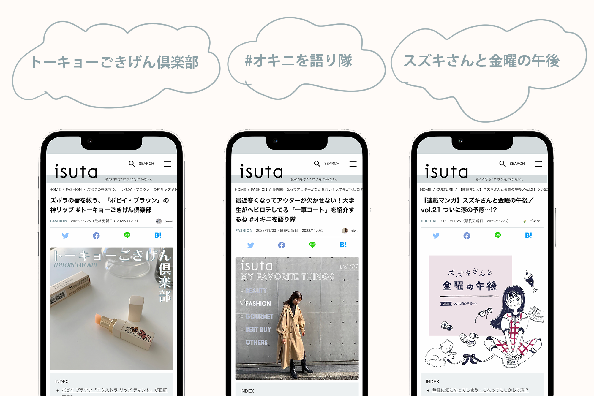 毎日をごきげんにしてくれる“ちょっといいもの”をisutaエディターが紹介するコラム「トーキョーごきげん倶楽部」、isuta編集部で働く学生インターンたちが、等身大の視点で「好きが溢れてくる瞬間」について語り合う企画「オキニを語り隊」のほか、毎週金曜日の18時に最新話が更新される、1話完結型の“オムニバス形式”の週刊連載マンガコンテンツ「スズキさんと金曜の午後」などのコンテンツも公開中。