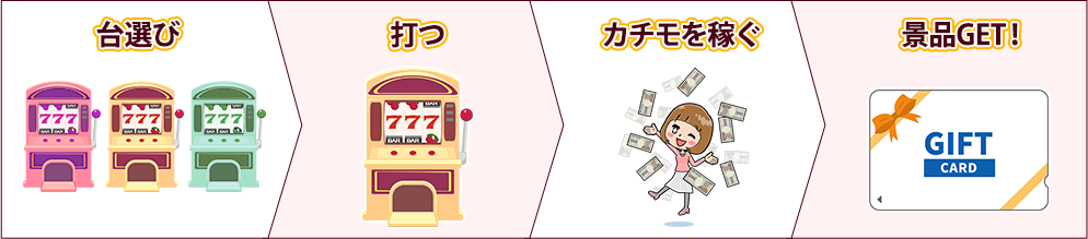②ポイント=カチモをコインや玉に交換してプレイします。プレイ後、コインや玉をカチモに交換し、カチモを増やしていきます。