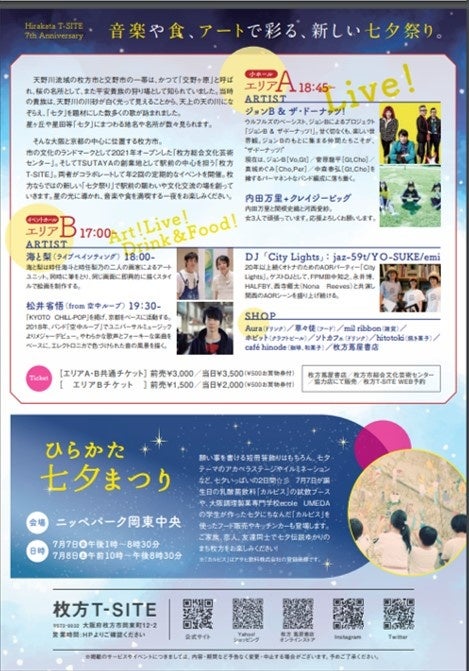 七夕と所縁のある枚方の新しい七夕祭りとして、今回は5組のアーティストによるライブやライブペインティングショーのほか、飲食店など8店が会場に集まるイベントを企画しました。星の光に導かれ、音楽、食、アートを満喫する一夜をお過ごしください。