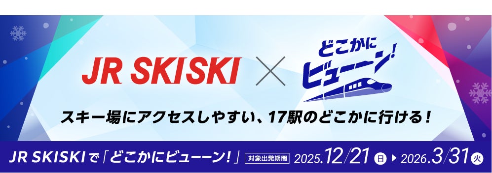 「どこかにビューーン!」の特別企画として、「JR SKISKIで『どこかにビューーン!』」を実施します。期間限定で、行き先候補をスキー場にアクセスしやすい17駅に限定してご利用いただけます。