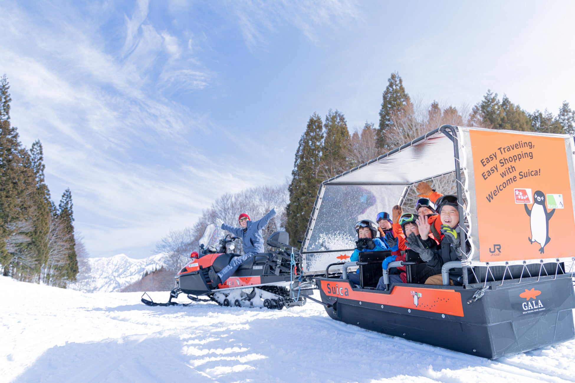 大きなそりをスノーモービルで引っ張り、お客さまを北エリアへご案内する人気アクティビティ「スノーモービルそりツアー」のお支払いにSuica等交通系電子マネーがご利用いただけます。