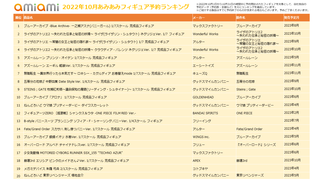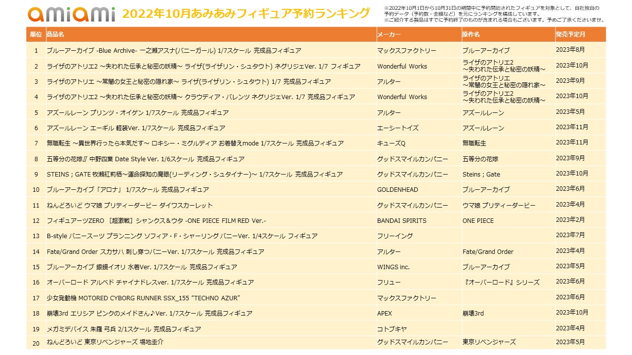 - ホビーショップ『あみあみ』の「2022年10月フィギュア予約ランキング」を発表!