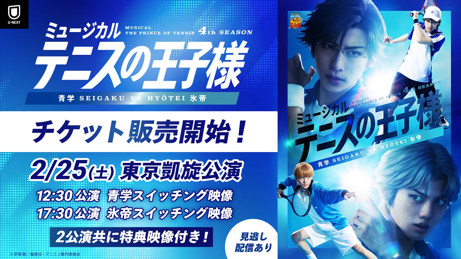 1月7日より上演中の「ミュージカル『テニスの王子様』4thシーズン 青学(せいがく)vs氷帝」について、U-NEXTでは2月25日(土)12:30/17:30公演<東京凱旋公演>、3月5日(日)17:30公演<東京凱旋公演 大千秋楽>を対象に、独占ライブ配信を実施いたします。配信購入特典として、各公演終了後に特典映像(回替わりキャストコメント映像)を配信予定です。
