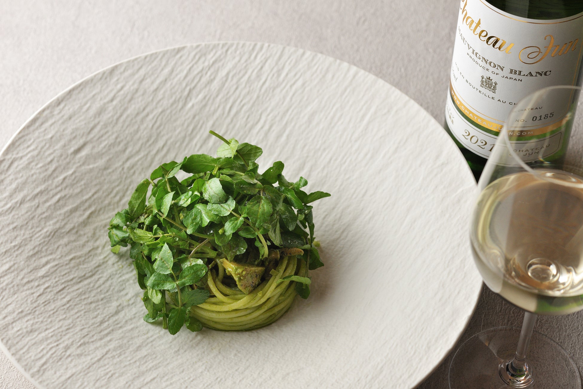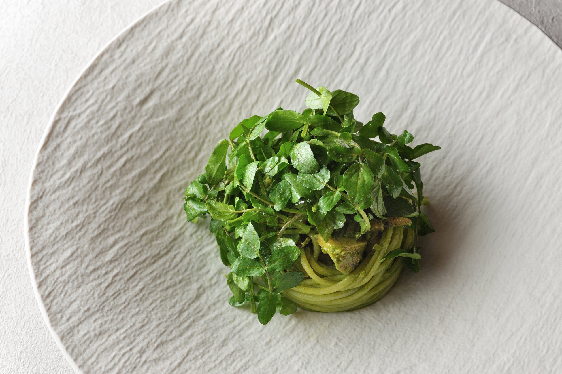 爽やかな辛さと瑞々しさが特徴のクレソンをジェノベーゼに仕立て、山梨の郷土料理である煮貝を合わせた一皿です。クレソンのしゃきしゃきとした食感と、煮貝の旨味を楽しめます。