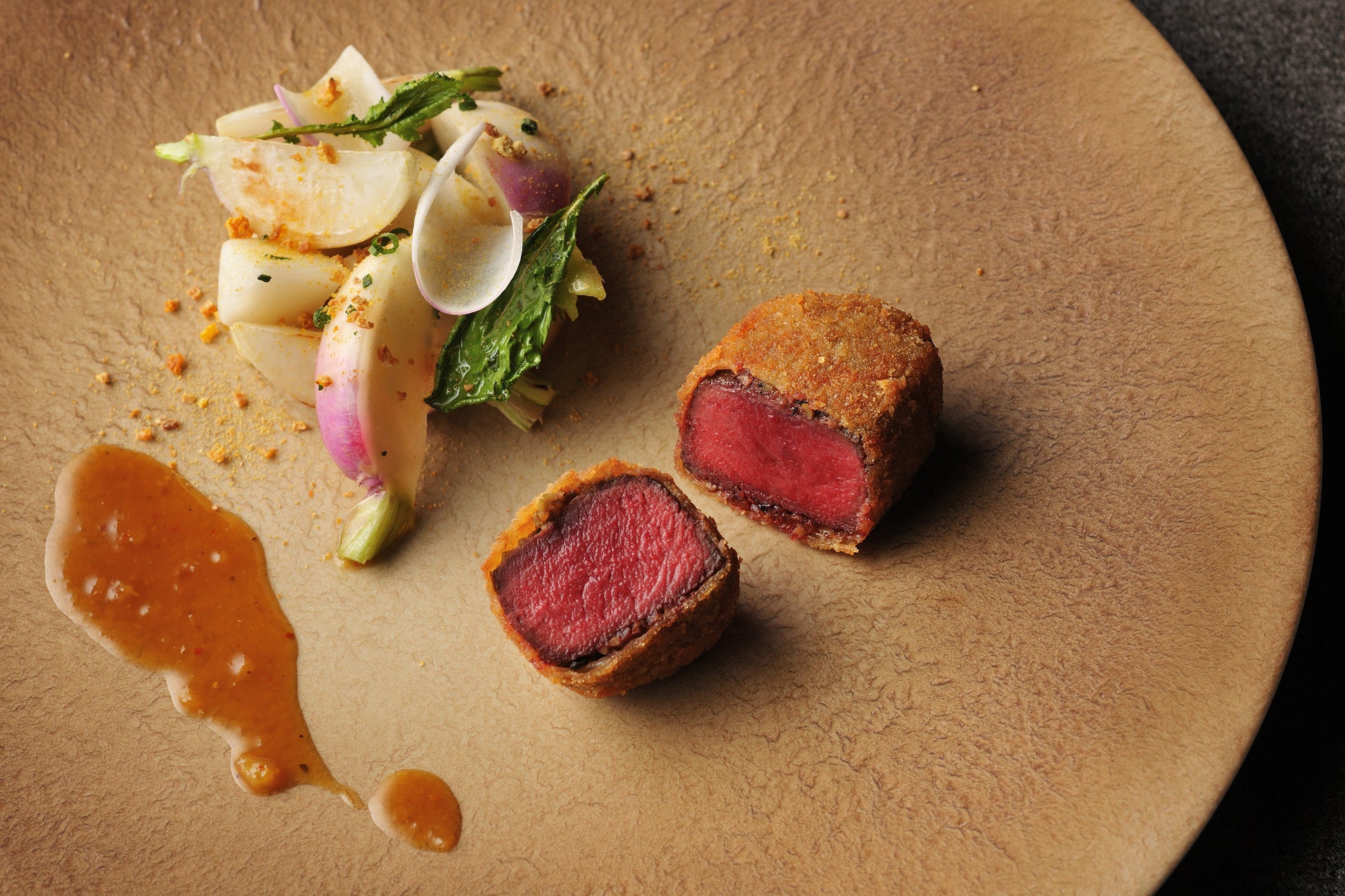 鹿肉のコトレッタ(*1)は、春に木の実を食べて旨味が凝縮された鹿肉を、スモーキーな香りが特徴のいぶりたくあんの衣で包みました。すりだね(*2)や柚子の塩漬けを加えたソースが鹿肉の味わいを引き立て、口に運ぶごとに旨味が広がります。優しい甘さが特徴のあやめ雪蕪は、3種類の調理法を用いて、香ばしさや甘さ、瑞々しさを引き出し、調理法によって異なる味わいを楽しめます。