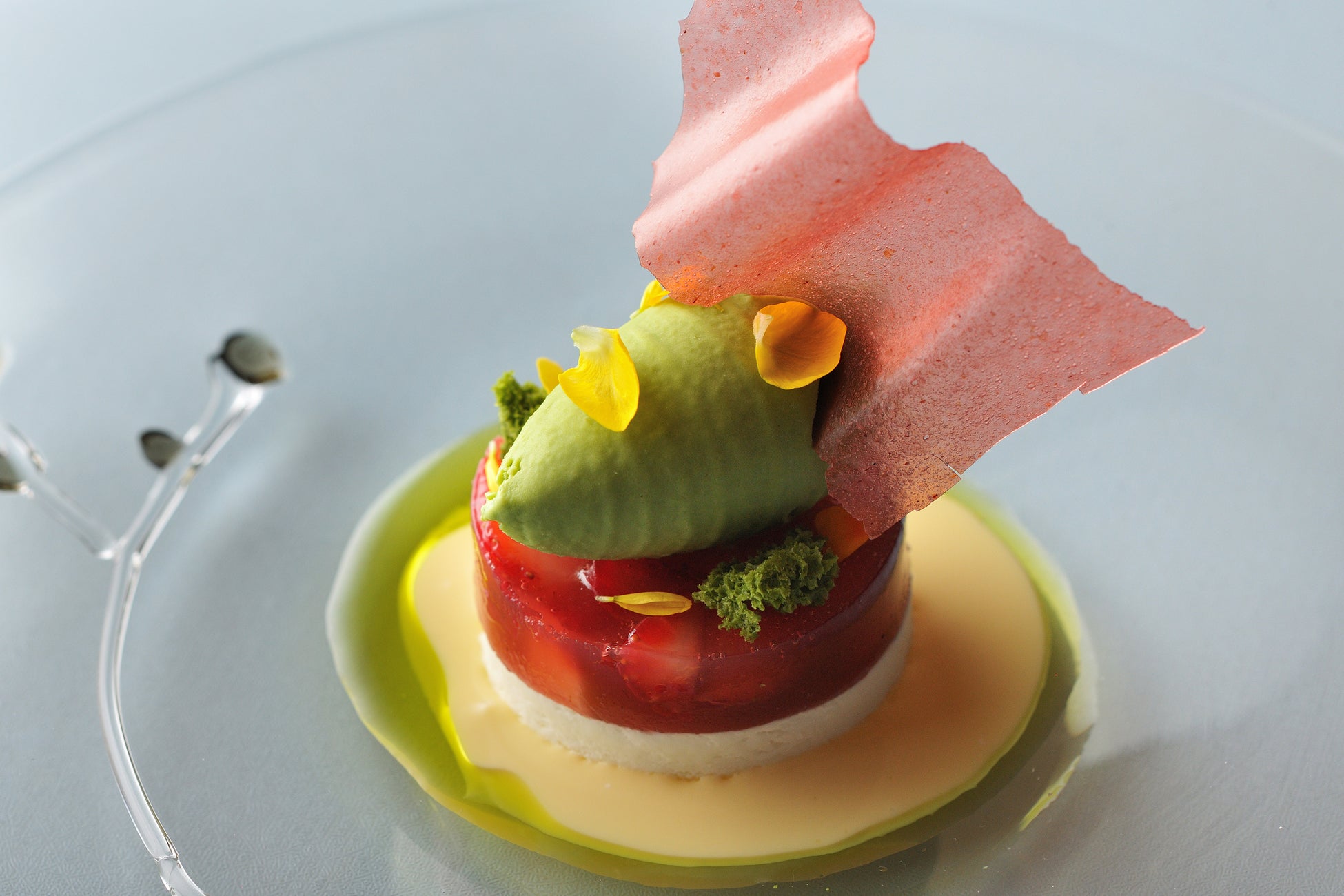 春に旬を迎える菜の花をジェラートに仕立て、苺やリコッタチーズと組み合わせました。菜の花のほろ苦さと苺の甘酸っぱさ、リコッタチーズのコクのある甘さが融合した、春らしい爽やかな味わいです。鮮やかな色合いで見た目からも春を存分に感じられる一皿です。