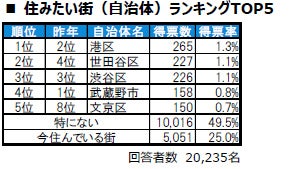 1位は港区、2位は世田谷区、3位は3年連続で渋谷区です。5位は文京区で、昨年8位から順位を上げてトップ5入りしています。「住みたい街(自治体)」は、東京都在住者が全国の自治体を対象に住みたい街を選んでいますが、4位の武蔵野市を含め、トップ5は全て東京都の自治体となっています。