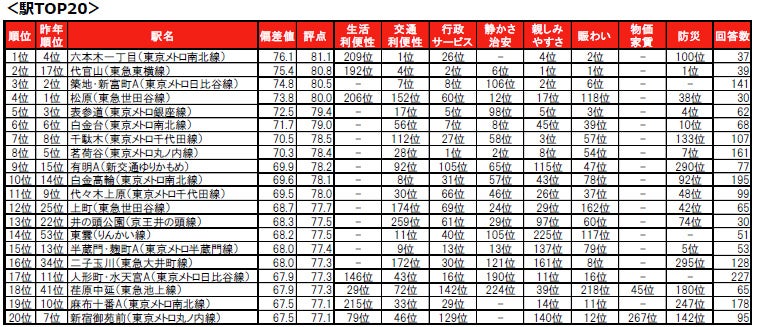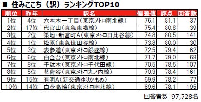1位は港区に位置する六本木一丁目(東京メトロ南北線)で、昨年4位から順位を上げてトップに輝きました。2位は渋谷区に位置する代官山(東急東横線)で、昨年17位から大きく順位を上げました。3位は、築地・新富町A【(東京メトロ日比谷線)(築地・東銀座・築地市場・新富町の近隣4駅を統合)】です。トップ10内では、9位に有明A【(新交通ゆりかもめ)(有明・国際展示場・東京ビッグサイト・有明テニスの森の近隣4駅を統合)】(昨年15位)、10位に港区に位置する白金高輪(東京メトロ南北線)(昨年14位)が、昨年から順位を上げてランクインしています。
