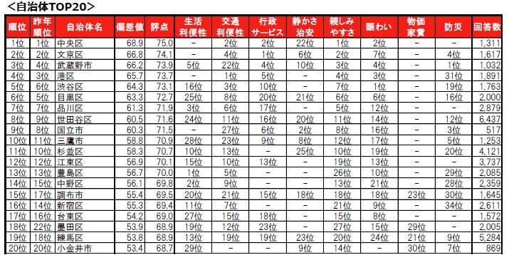 トップ2は7年連続で、1位は中央区、2位は文京区です。3位は武蔵野市で、昨年4位から一つ順位を上げてトップ3入りしています。トップ20内では、18位に墨田区(昨年22位)が昨年から順位を上げてランクインしています。
