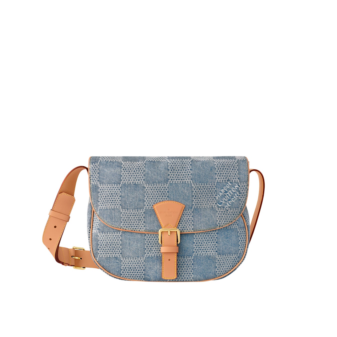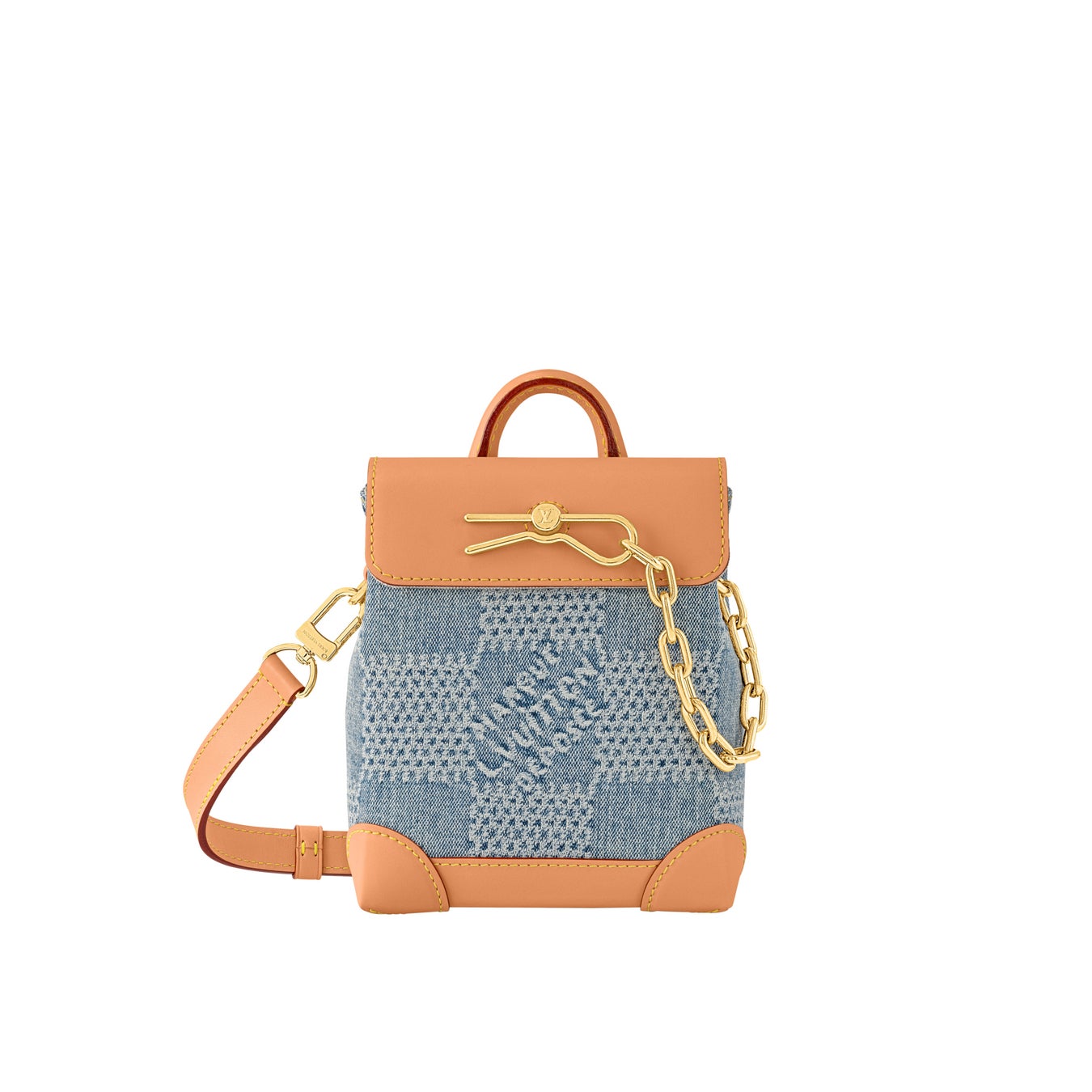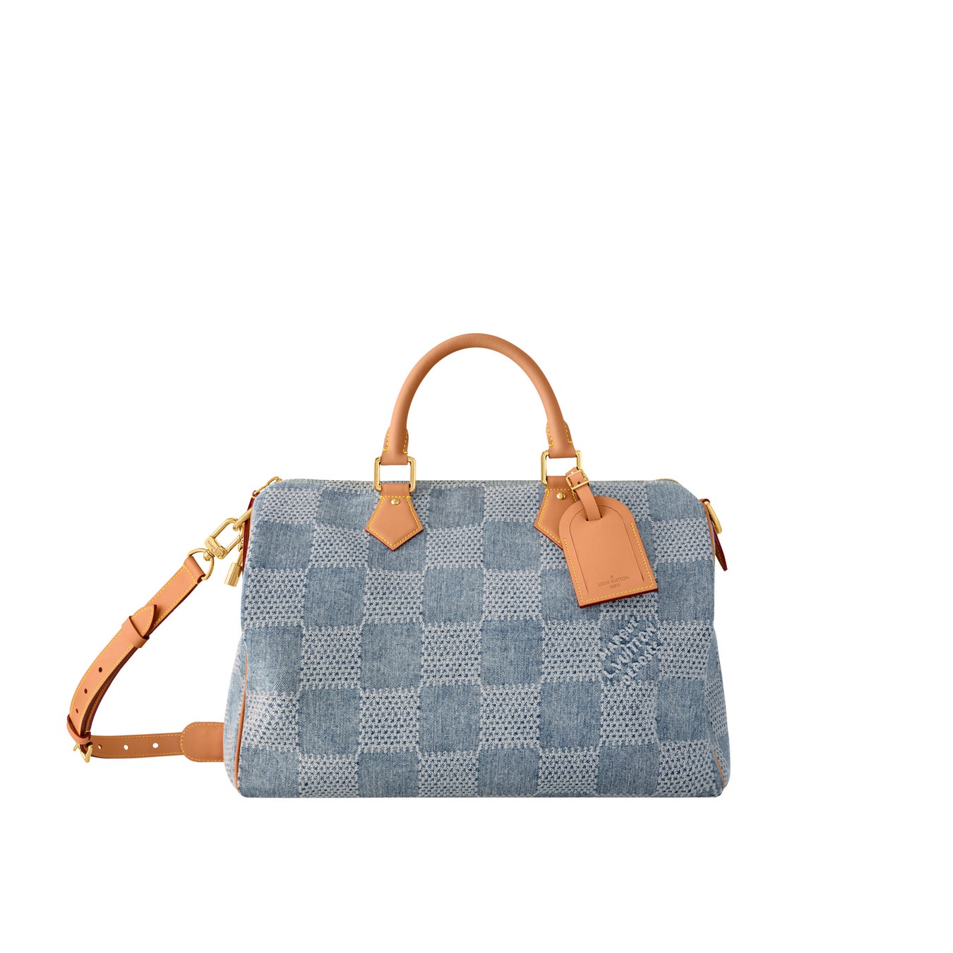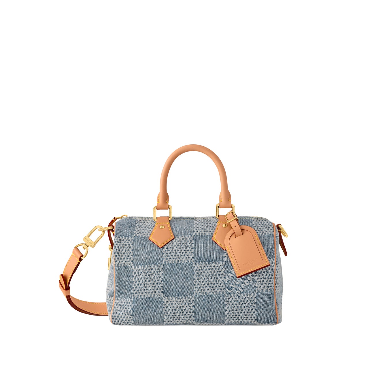 ダミエ·デニム 3D コットンキャンバスの「スピーディ·バンドリエール 25」は、カットした生地をブリーチしてから染色することで色褪せたような風合いを実現し、メゾンを象徴するダミエ·パターンを夏らしいバージョンにアップデートしました。さらに洗いをかけて少し収縮させた素材がさりげなく市松模様を浮かび上がらせています。