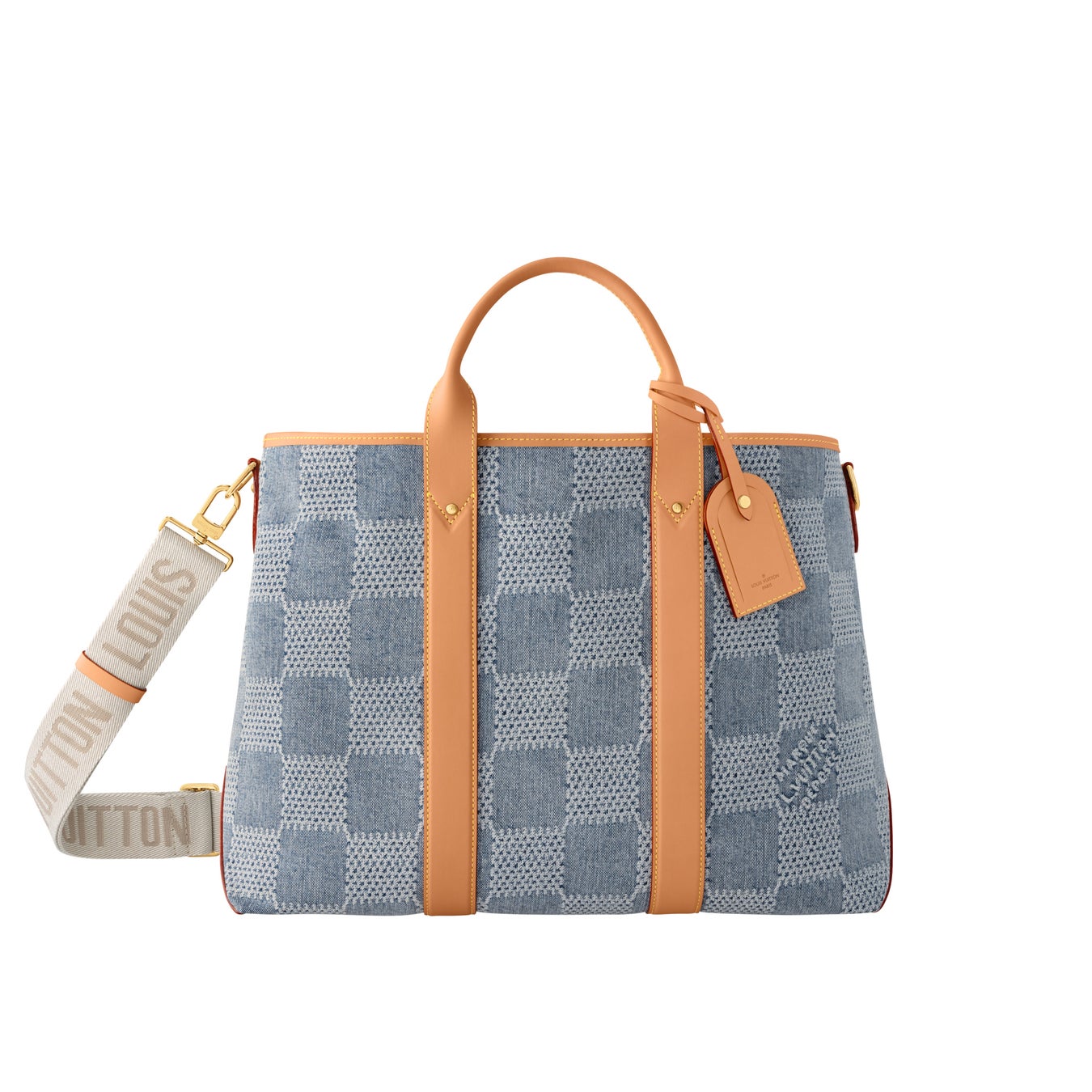 メゾンならではのディテールを散りばめた、エレガントな「ウィークエンド·トートNM」。ダミエ·デニム 3D コットンキャンバスで仕立て、ヌメ革のトップハンドルとサイドバンドをあしらいました。GOTS認証済みのオーガニックコットンを使用し、ファレルお気に入りのルイ·ヴィトンの定番である市松模様のパターンがデニムで再解釈されています。