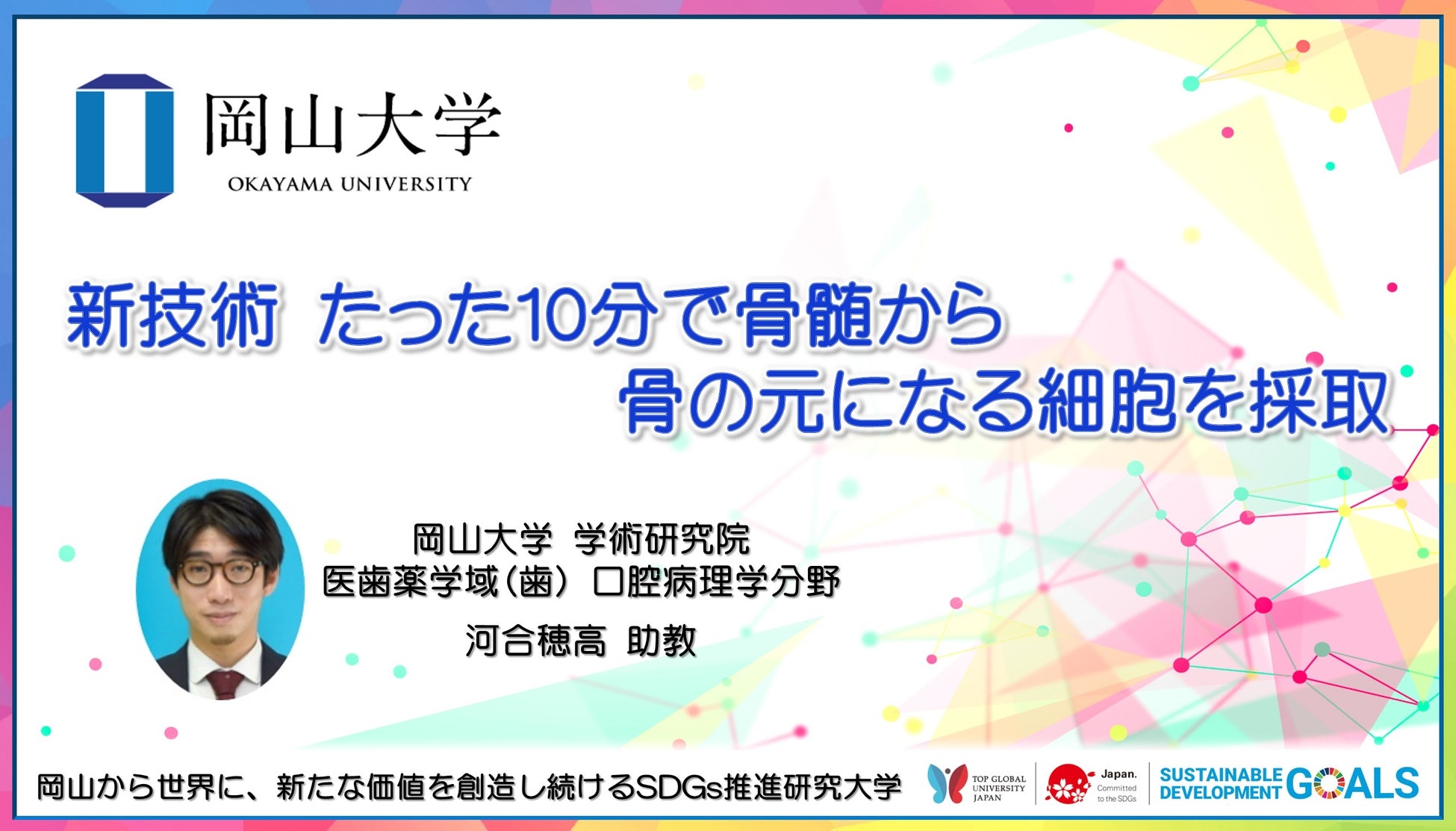 国立大学法人岡山大学(本部:岡山市北区、学長:槇野博史)学術研究院医歯薬学域 口腔病理学分野(長塚仁教授)の河合穂高助教の共同研究グループは、骨髄組織から、骨や軟骨に分化する間葉系幹細胞を短時間で多量に採取する新技術を開発しました。また、採取した細胞群は移植可能であり、移植後2ヶ月経っても骨や軟骨に分化する細胞が存在することがわかりました。