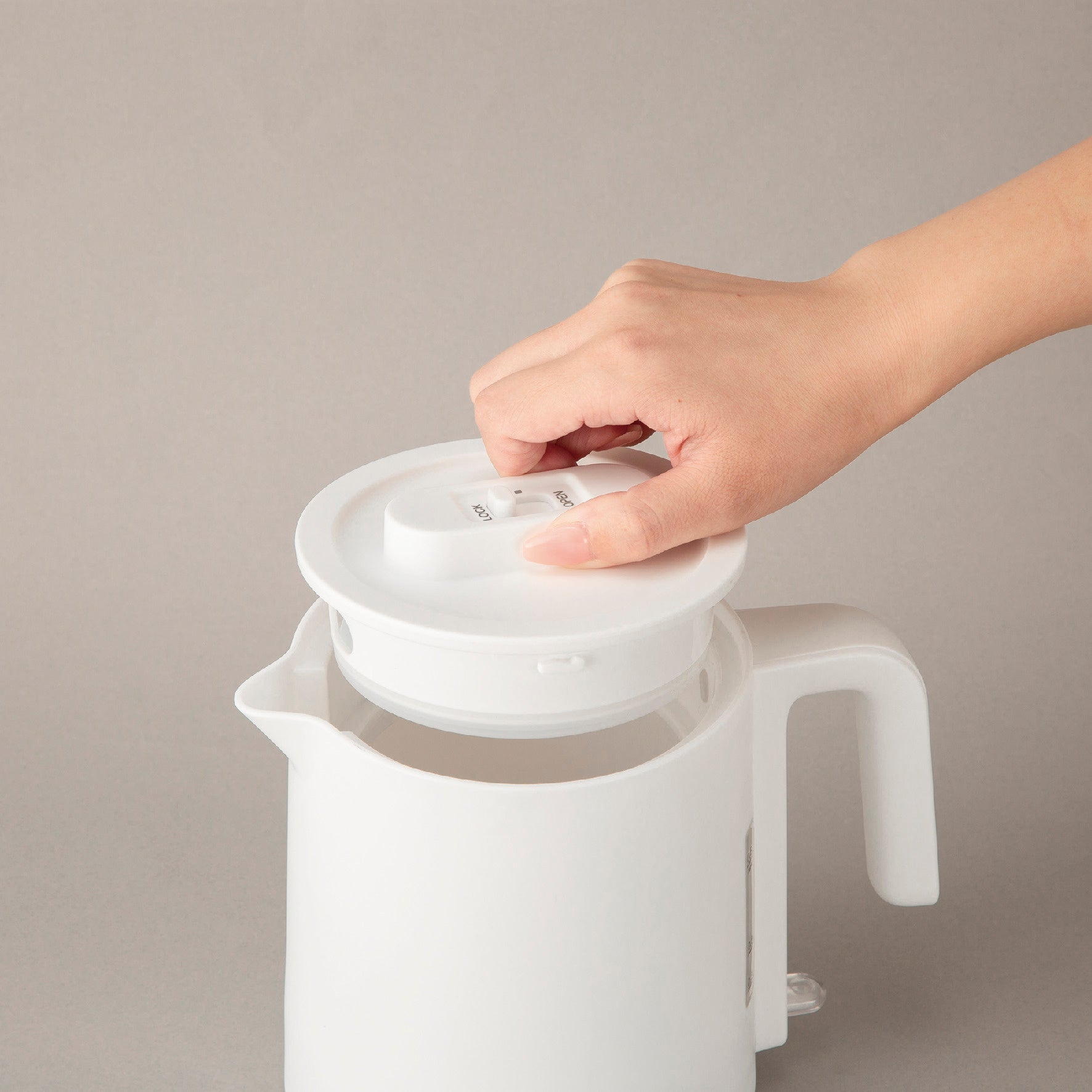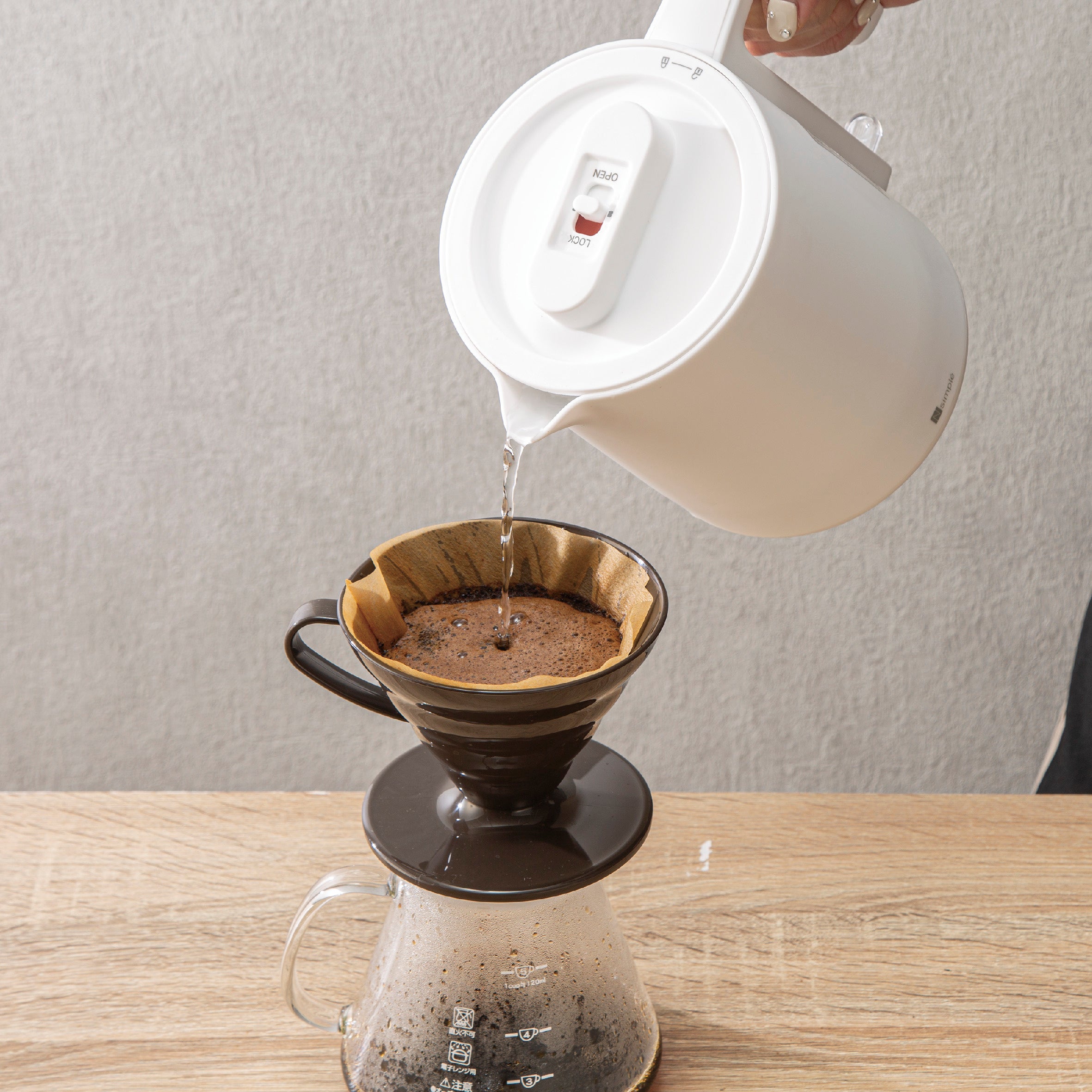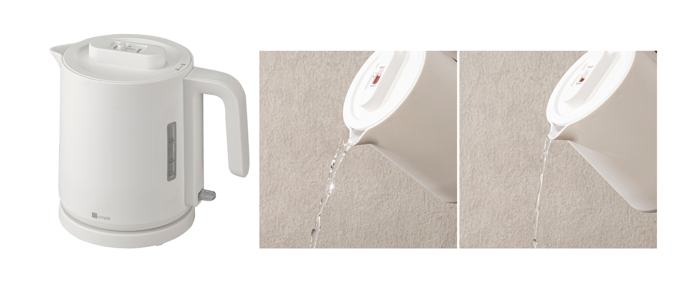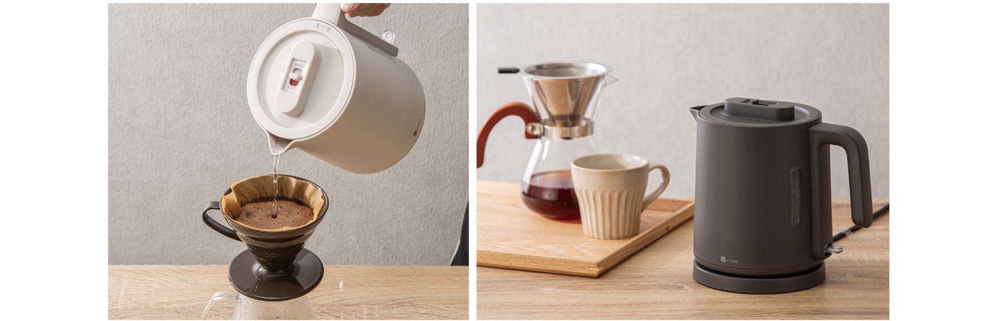 そしてこの度、レバーを操作するだけで簡単に2段階の湯量調節ができる嬉しい機能が備わった「湯量が調節できる電気ケトル0.8L」を発売しました。