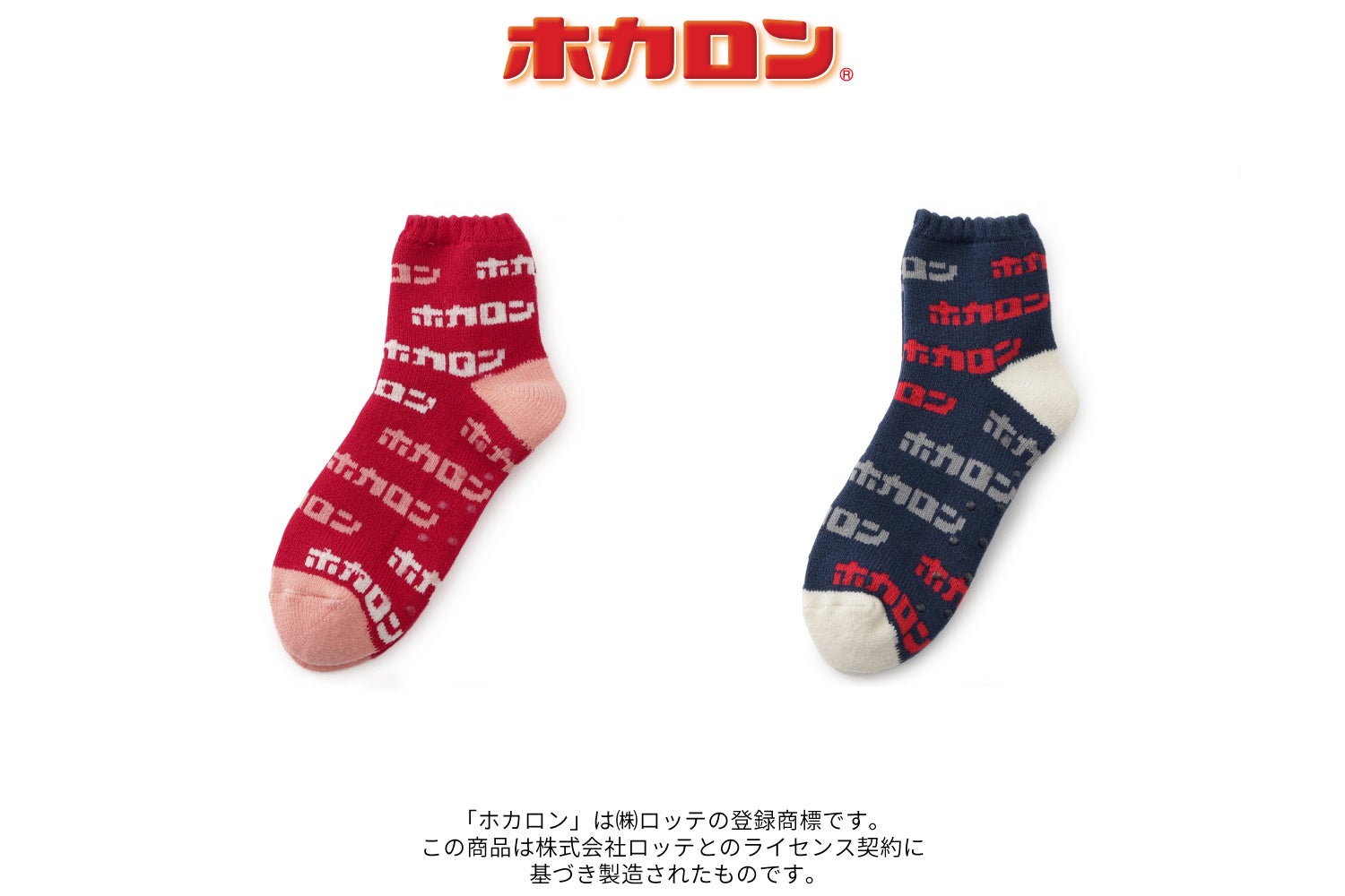 ●デザイン:足裏に大きなレトロかわいい「ホカロン」のロゴがデザインされたショート丈のルームソックス。裏起毛総パイル編みなので、足元を温かく包み込み、履き口は締め付けにくくやわらか。足底滑り止め付き。リラックスタイムや冷え性対策、大切な人へのプレゼントにもおすすめです。
