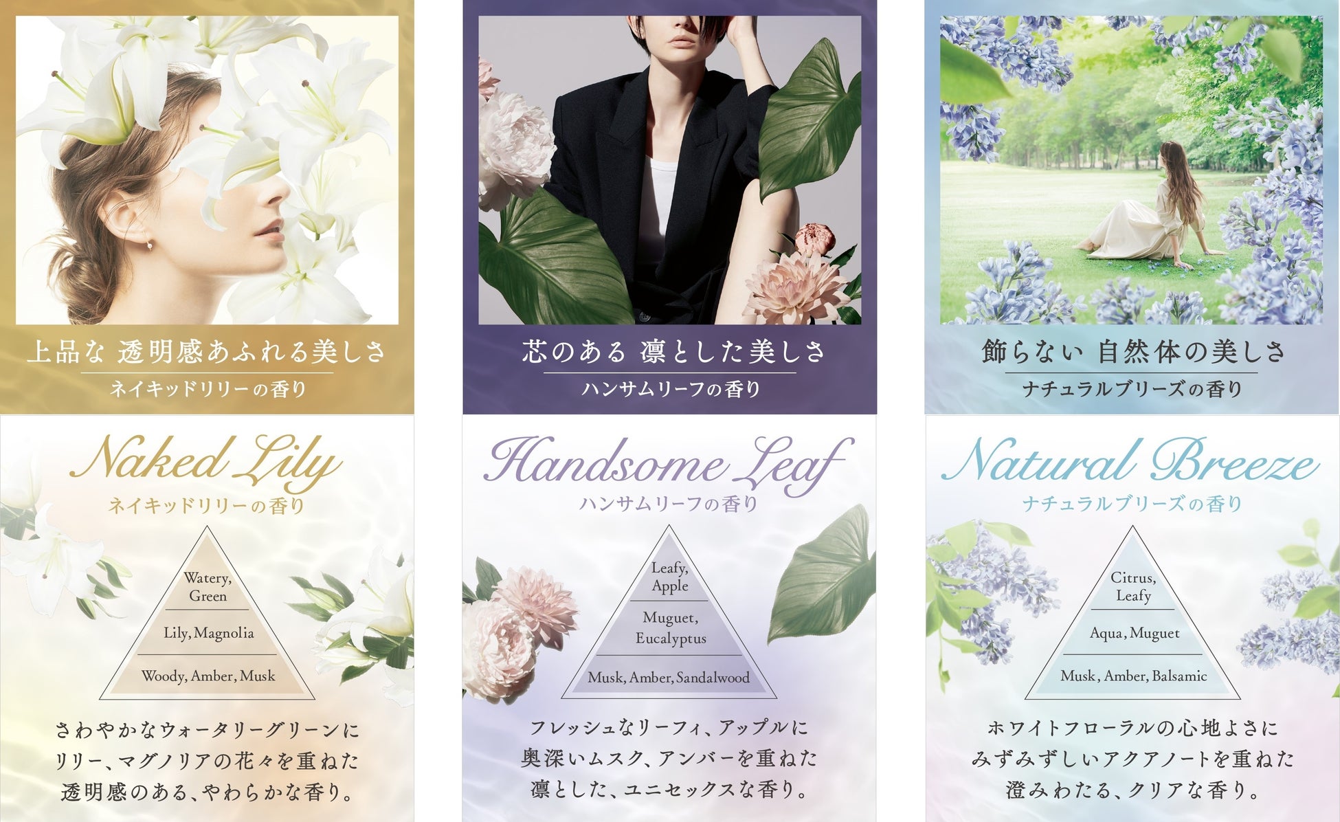 今回、新たに仲間入りした「ハンサムリーフの香り」は、昨今のビューティトレンドを反映し、男女問わず楽しめるユニセックスな香りです。また「ナチュラルブリーズの香り」は、澄みわたるクリアな香りで、トレンドのナチュラルテイストを好む方に向けた香りとなっております。