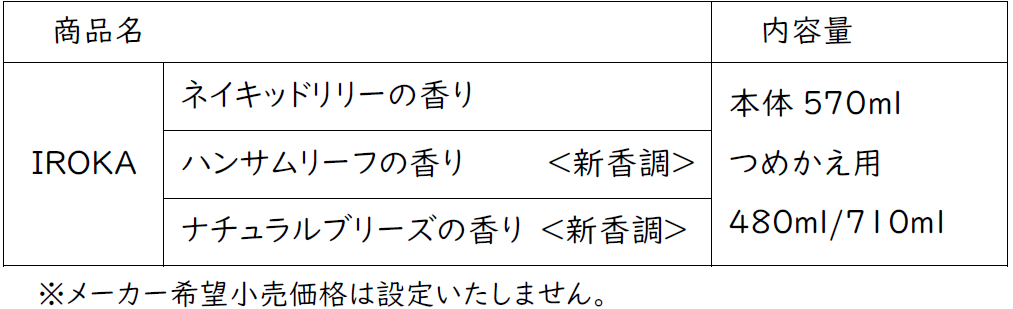 新しくなった「IROKA」は、“美しさの多様性”に寄り添い、“あなたらしい美しさ”で選べる3つの上質な香りを提案いたします。上品な透明感あふれる美しさ「ネイキッドリリーの香り」、芯のある凛とした美しさ「ハンサムリーフの香り」、飾らない自然体の美しさ「ナチュラルブリーズの香り」をラインアップしました。香水のように上質、なのに透明感あふれる香りで、“あなたらしい美しさ”を上品にさりげなく引き立てます。
