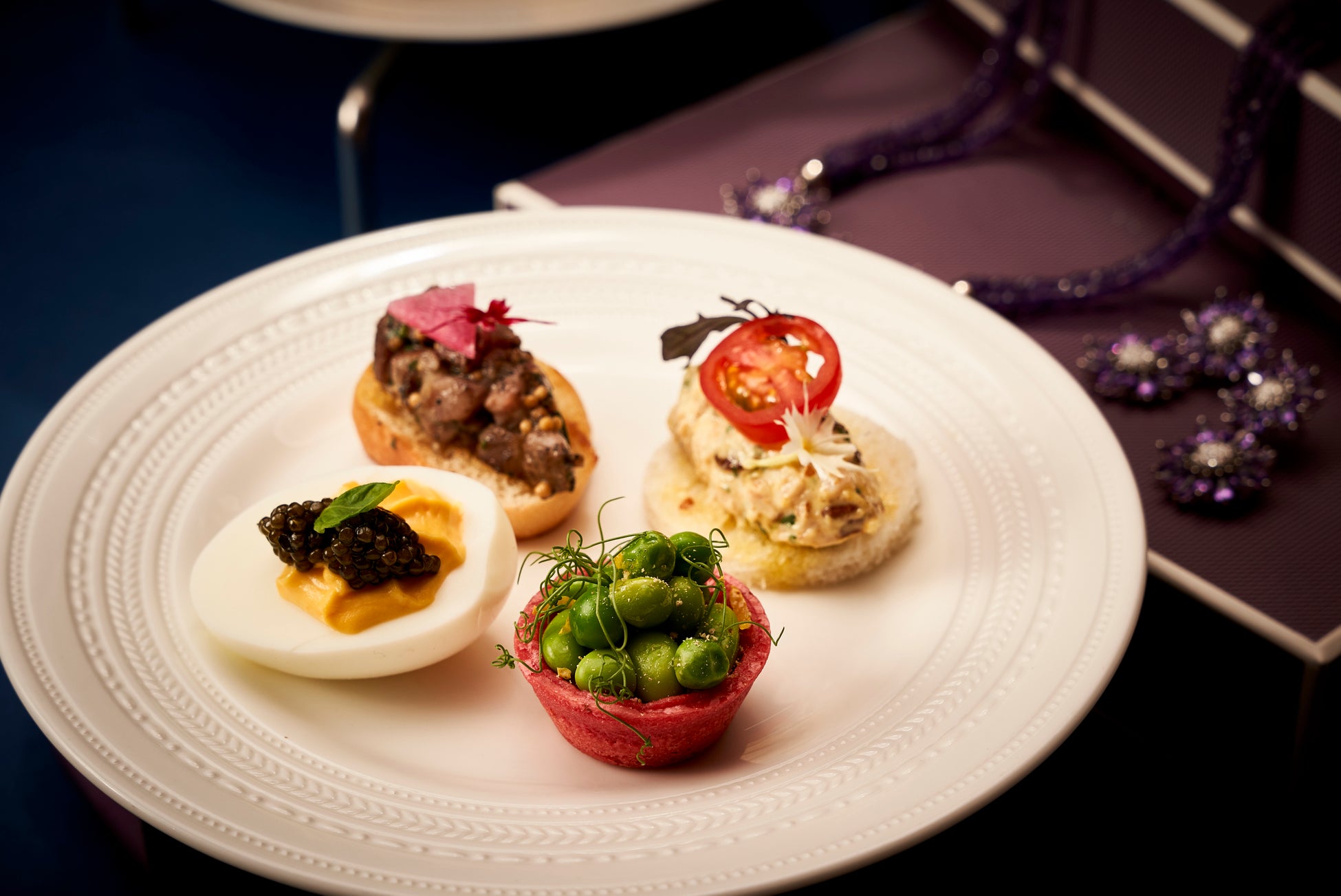 エンドウ豆 枝豆 レモン 弓削牧場リコッタのタルトレット、コロネーションチキン チェリートマト プルマンブレッド、デビルドエッグ オシェトラキャビア、ローストビーフ トリュフと粒マスタードのサラダ クロスティーニ