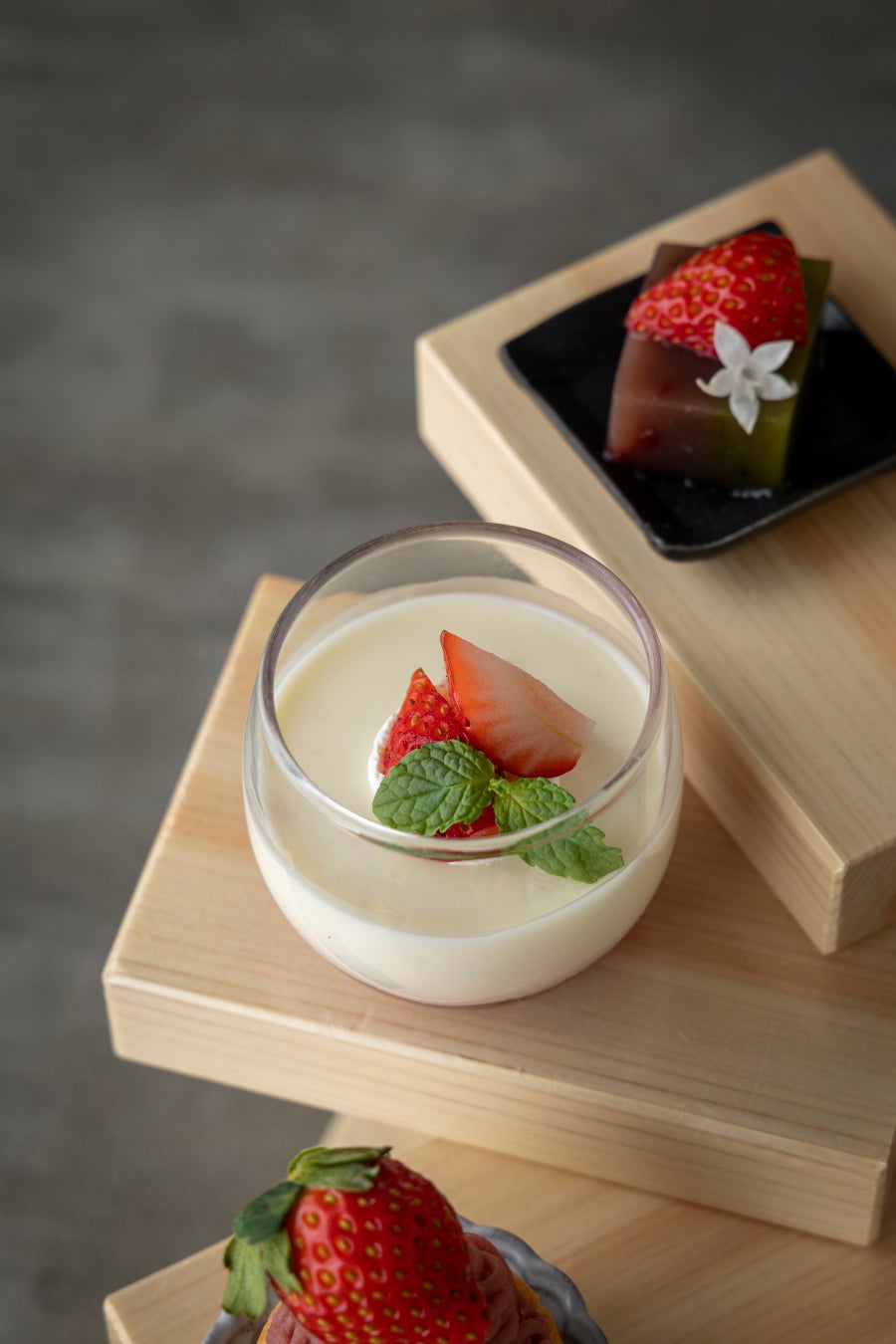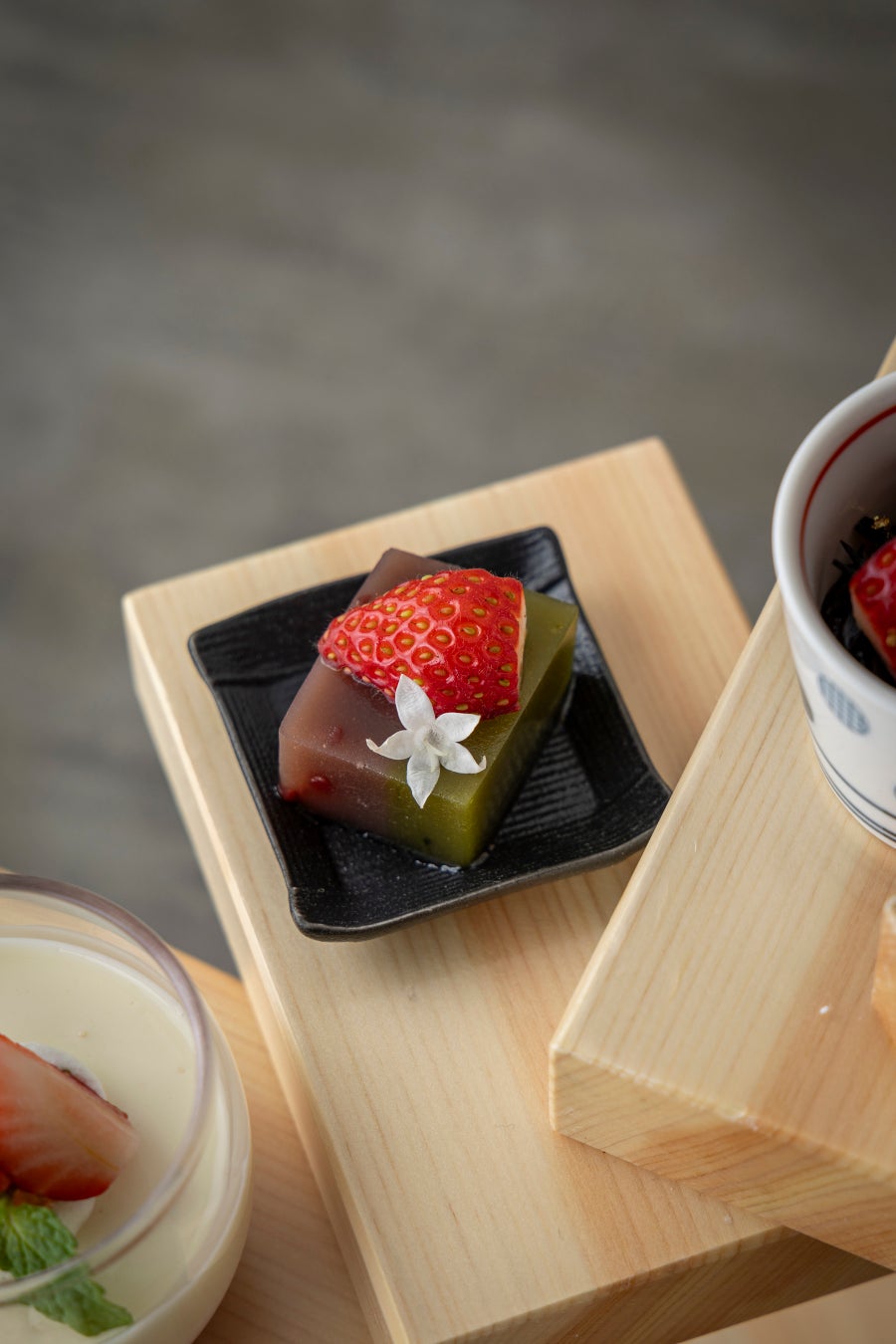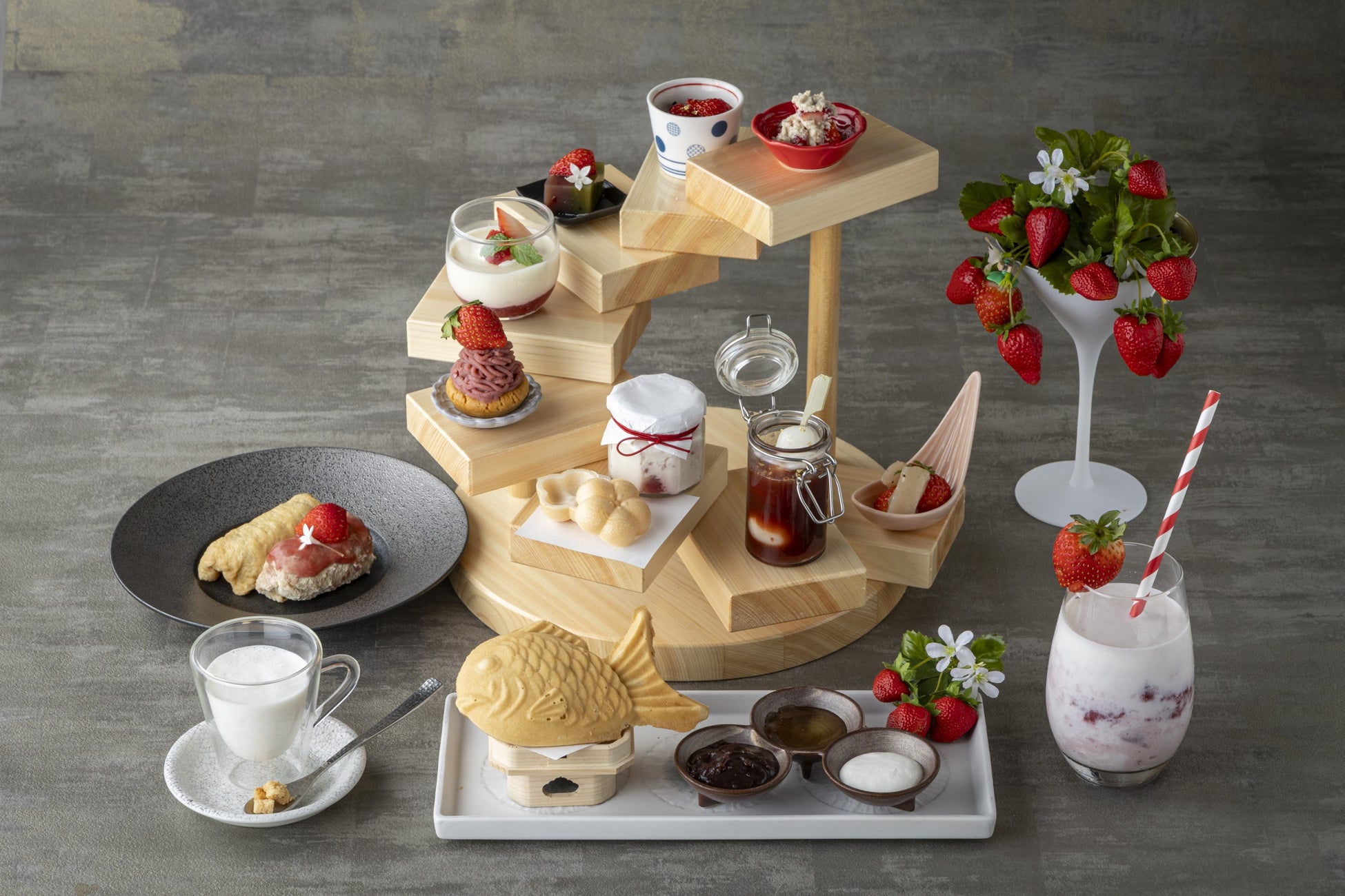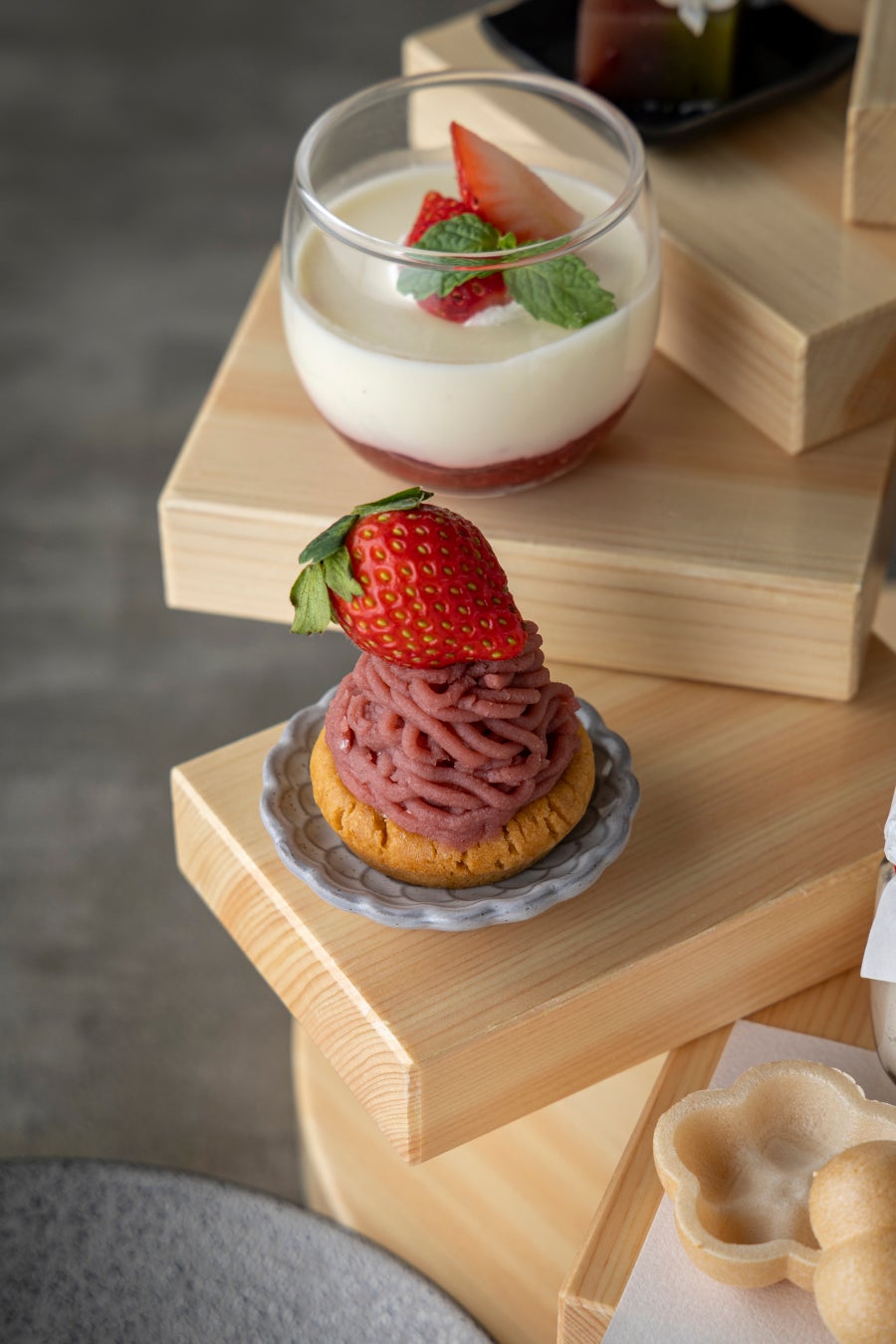 旬の苺をふんだんに使用し、職人が丹精込めて作り上げたアフタヌーンティー。苺を丸ごと一粒使用した「苺のモンブラン」をはじめ、「苺のみたらし団子」や「苺のレアチーズ最中」など、苺をしっかりと感じられる甘味。また「苺の白和え」などの和食店ならではのセイボリーも魅力です。