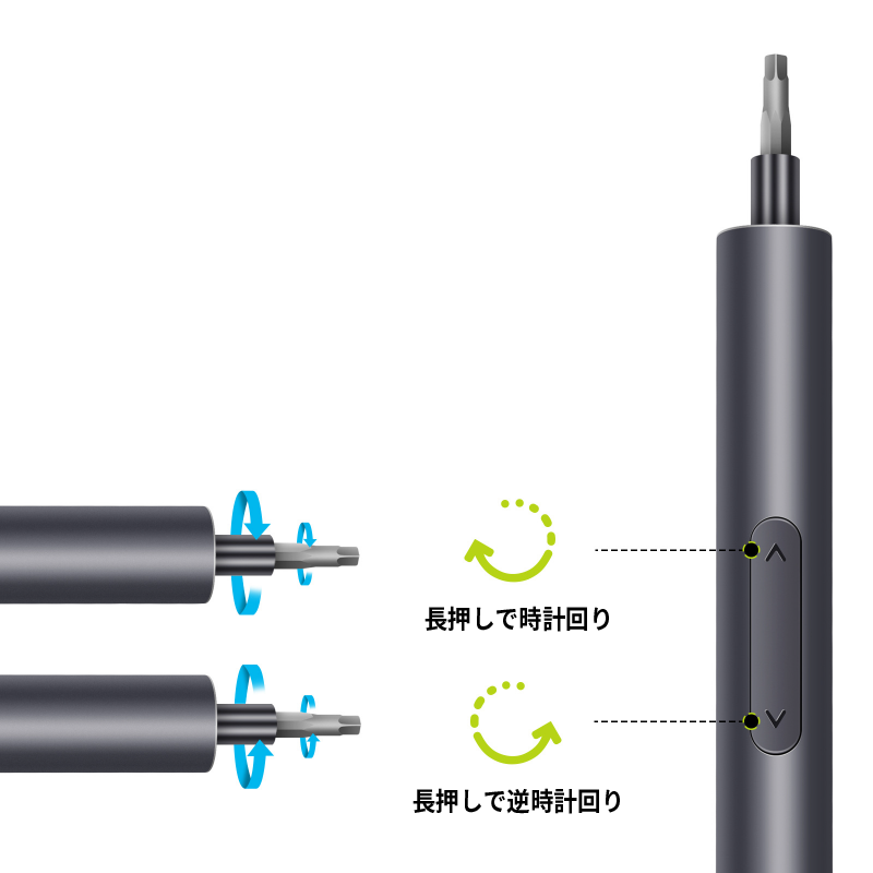 時計回り、反時計回りを指先のボタンで切り替えることができるため、簡単にネジを締めたり緩めたりすることができます。
