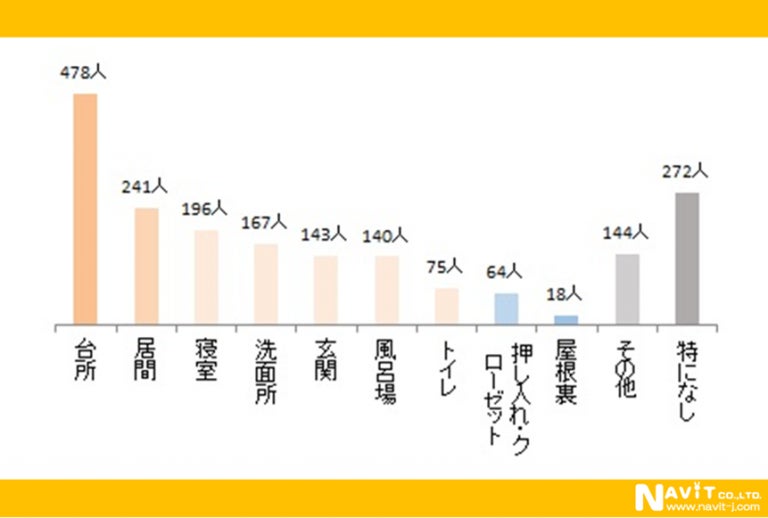 害虫が出て困っている場所で一番多いのは「台所」で478人。「居間」241人や「寝室」196人など2位以下にかなり差をつけています。