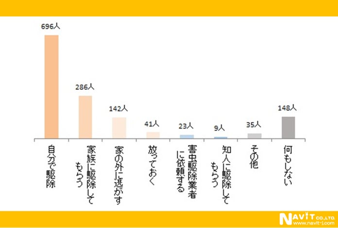 害虫の駆除をどのようにするかは「自分で駆除」する人が696人。回答数に対する割合は約半数でした。
