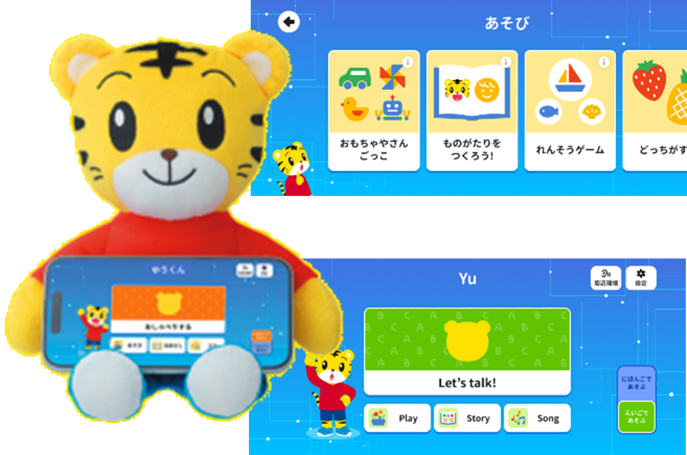AI「しまじろう」は、専用のスマートフォンアプリと、スマートフォンをホールドできる専用の「しまじろうぬいぐるみ」を組み合わせて使用します。しまじろうの声を再現したAI「しまじろう」とお子さまが自由に会話できる「おしゃべり」機能や、お子さま一人でも飽きずに取り組める「あそび」機能などを搭載しています。さらに、会話中のお子さまの感情や興味の動きについて、保護者の方に専用サイトでレポートします。