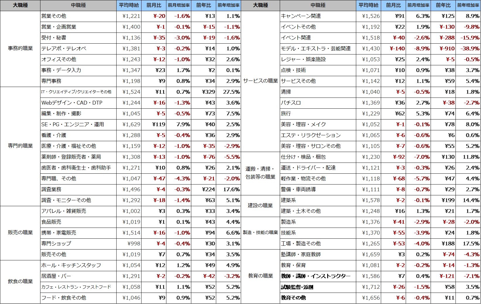 職種別の平均時給は、7職種の大カテゴリで前年同月を上回りました。事務的職業は1,357円(前月比22円増、前年比48円増)、専門的職業は1,263円(前月比7円減、前年比25円増)、飲食の職業は1,054円(前月比11円増、前年比49円増)、販売の職業は1,052円(前月比6円増、前年比33円増)、サービスの職業は1,262円(前月比12円増、前年比15円増)、運搬・清掃・包装等の職業は1,204円(前月比88円減、前年比109円増)、建設の職業は1,466円(前月比64円増、前年比151円増)となり、前年より増加しました。製造・技能の職業は1,371円(前月比44円減、前年比17円減)、教育の職業は1,592円(前月比1円減、前年比79円減)となり、前年より減少しました。