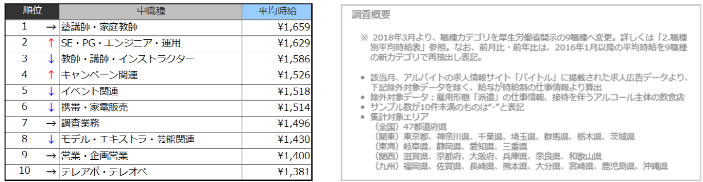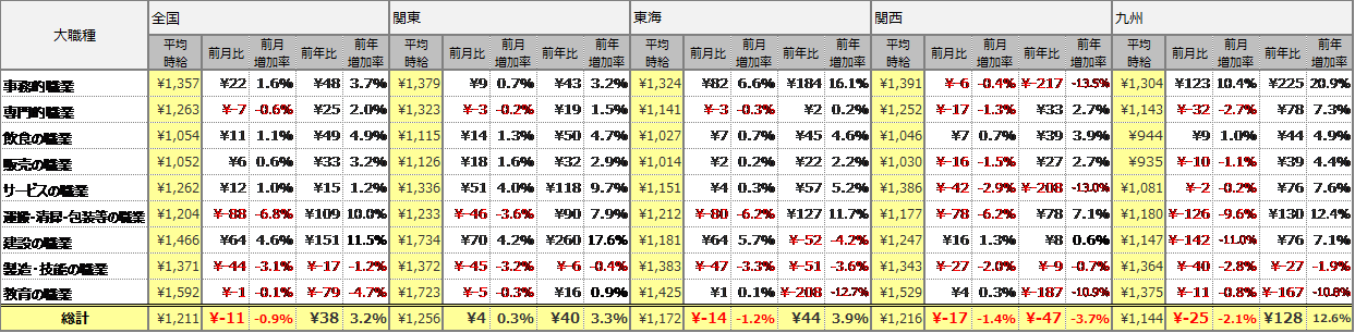 関東エリアの平均時給は1,256円(前月比4円増、前年比40円増)、東海エリアの平均時給は1,172円(前月比14円減、前年比44円増)、関西エリアの平均時給は1,216円(前月比17円減、前年比47円減)、九州エリアの平均時給は1,144円(前月25円減、前年比128円増)となりました。