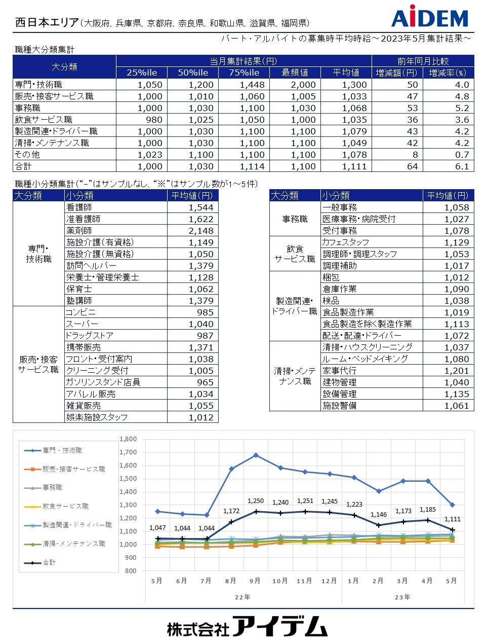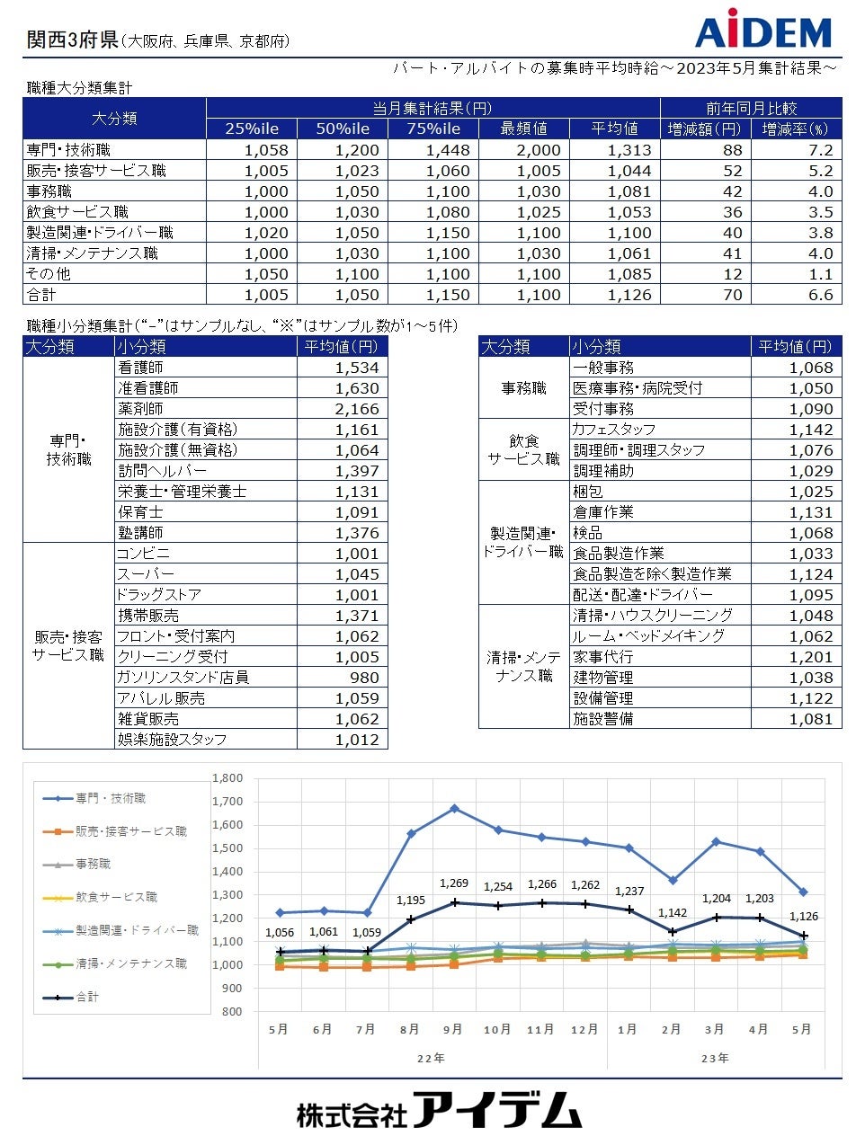 職種大分類別の平均時給は、「専門・技術職」1,313円(前年同月比88円増)、「製造関連・ドライバー職」1,100円(同40円増)、「事務職」1,081円(同42円増)、「清掃・メンテナンス職」1,061円(同41円増)、「飲食サービス職」1,053円(同36円増)、「販売・接客サービス職」1,044円(同52円増)の順で、前年同月比で全ての職種がプラスとなった。府県別の平均時給は、大阪府1,172円(前年同月比85円増)、京都府1,086円(同35円増)、兵庫県1,074円(同60円増)の順となり、前年同月比で全ての府県がプラスとなった。