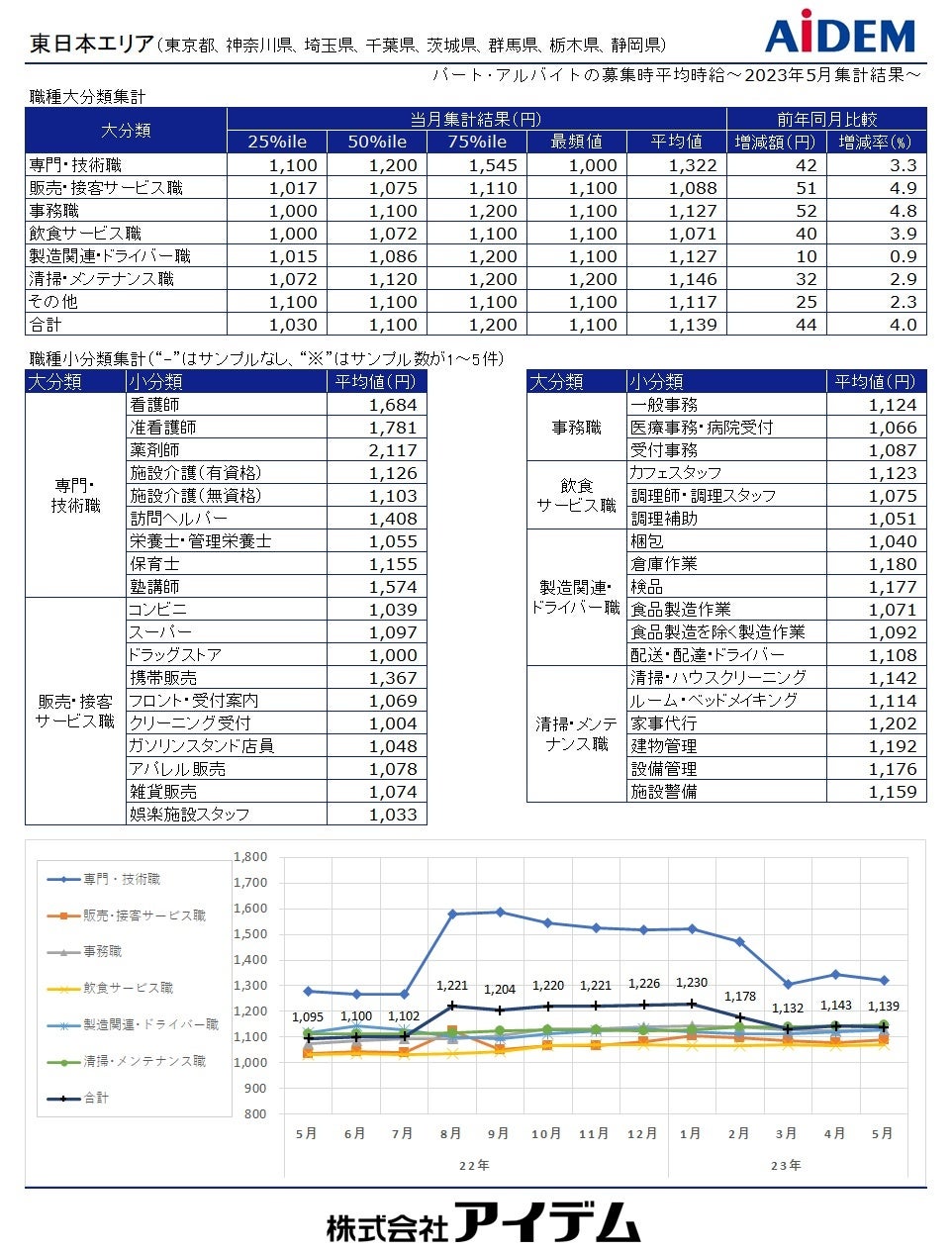 職種大分類別の平均時給は、「専門・技術職」1,341円(前年同月比40円増)、「清掃・メンテナンス職」1,162円(同34円増)、「事務職」1,161円(同65円増)、「製造関連・ドライバー職」1,153円(同25円増)、「販売・接客サービス職」1,103円(同44円増)、「飲食サービス職」1,091円(同37円増)の順で、前年同月比で全ての職種がプラスとなった。都県別の平均時給は、東京都1,193円(前年同月比24円増)、神奈川県1,175円(同43円増)、埼玉県1,114円(同65円増)、千葉県1,108円(同40円増)の順となり、前年同月比で全ての都県がプラスとなった。