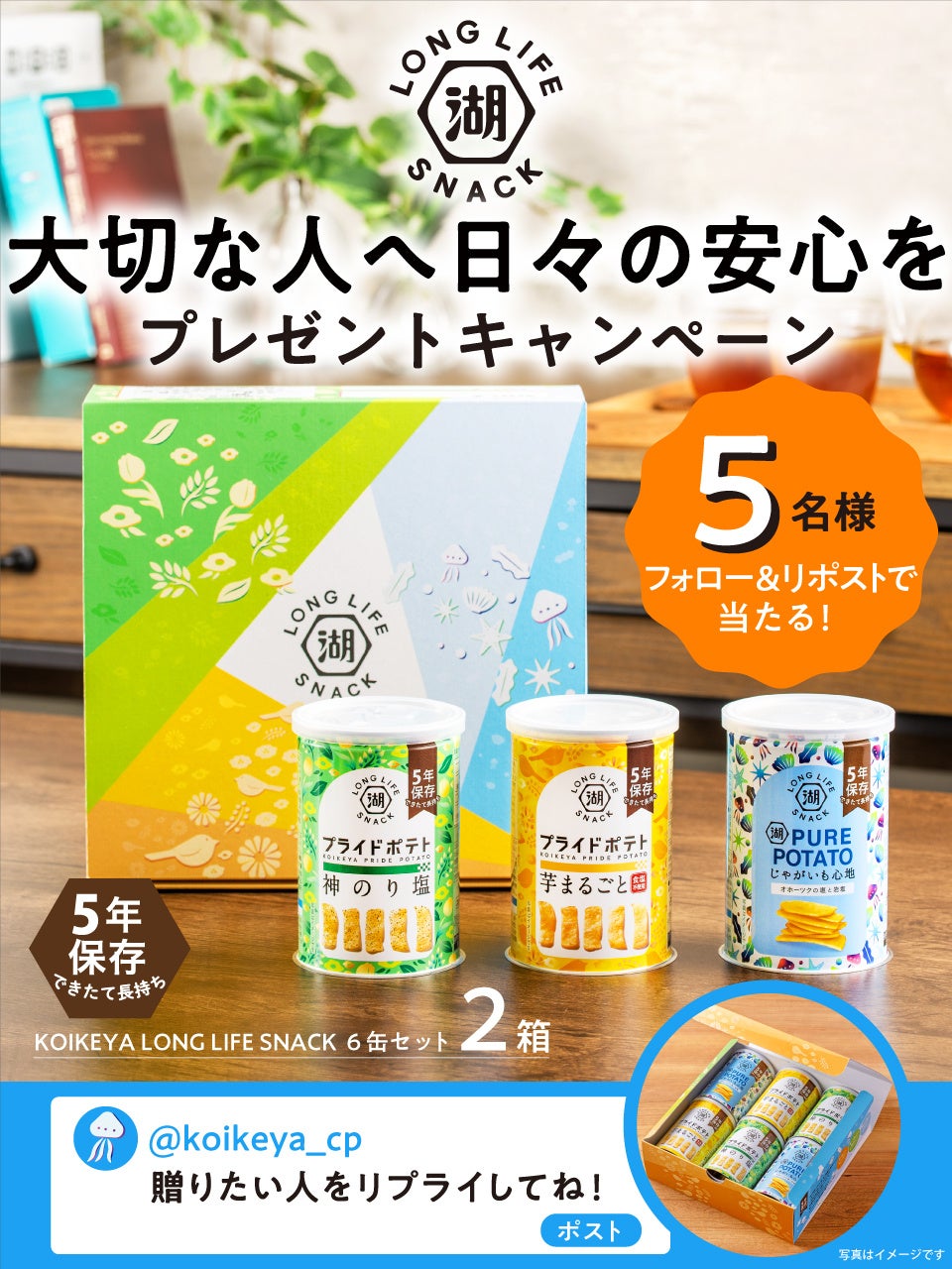 「KOIKEYA LONG LIFE SNACK」のリニューアル発売を記念して、湖池屋オンラインショップ限定で発売する6缶セットを、2箱合わせて抽選で5名様にプレゼントするキャンペーンを実施します。1箱はご自身の備蓄用、もう1箱は大切な人へのプレゼント用として、日々の安心に繋げていただけますと幸いです。Twitter(現X)のフォロー&リツイートで簡単応募のキャンペーンですので、ぜひご参加ください。ご応募の際には、あなたが安心を贈りたい人は誰か、リプライしていただけると嬉しいです!