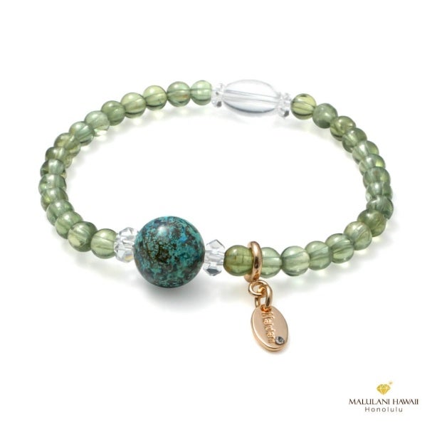 HULA~空 lani~は、空や海の象徴アクアマリンを冠に、母なる地球の象徴クリソコラ、太陽神の象徴ペリドットなど、ハワイの大自然に包まれる癒しの石をセレクトしたブレスレット。