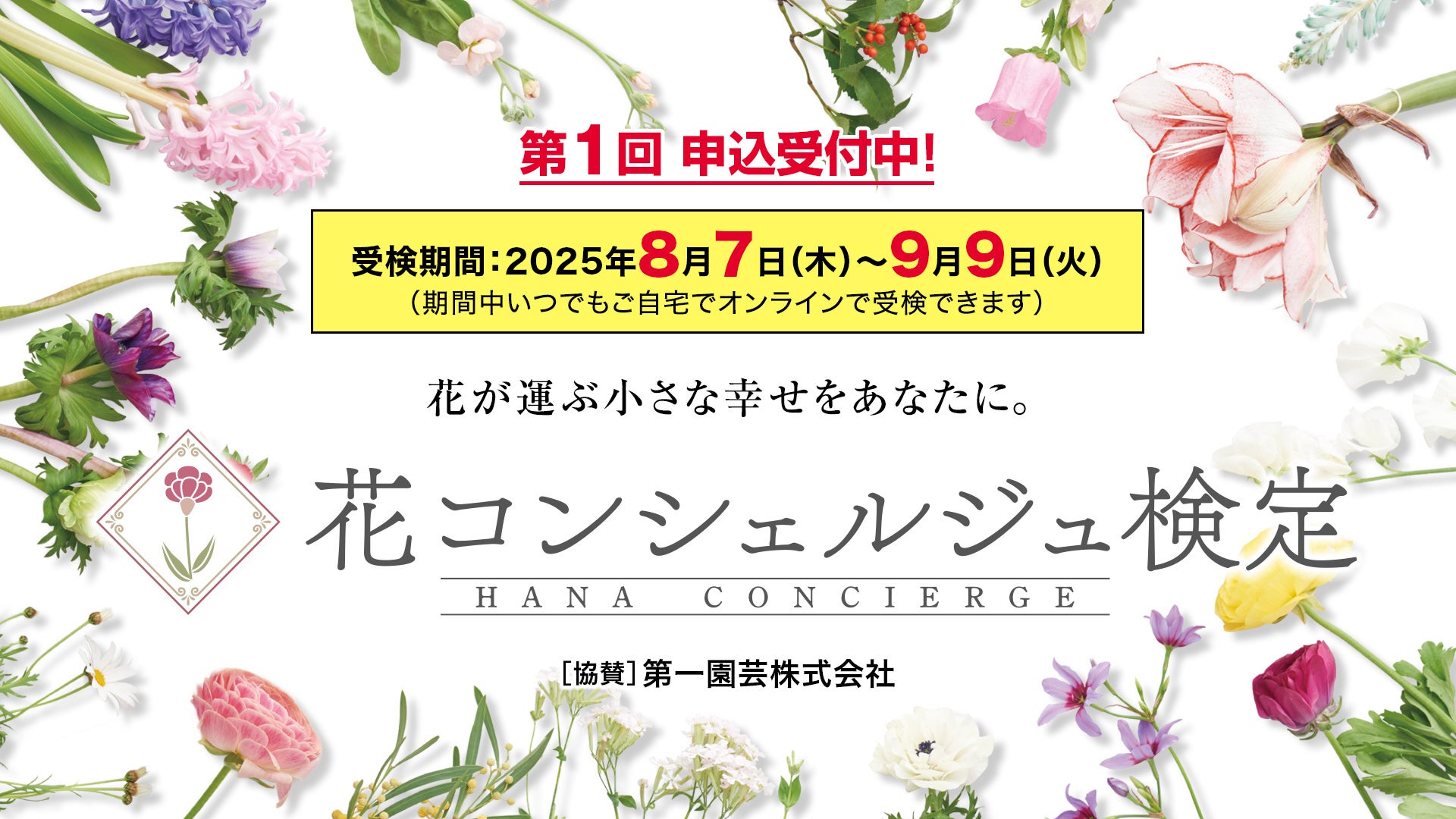 『花コンシェルジュ検定』は、花き園芸業界のトップランナーである第一園芸株式会社の協賛で実施します。本検定は、花の種類や特徴、花言葉に込められた意味やエピソードなどの知識を問う検定。趣味として気軽にお花の魅力を楽しみたい方、教養としての知識を身につけたい方はもちろん、フラワーショップなどにお勤めの方にも、とてもお勧めです。