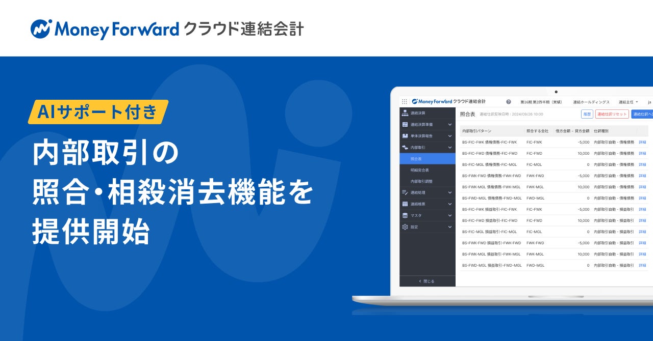 『マネーフォワード クラウド連結会計』、AIサポート付の「内部取引の照合・相殺消去」機能を提供開始