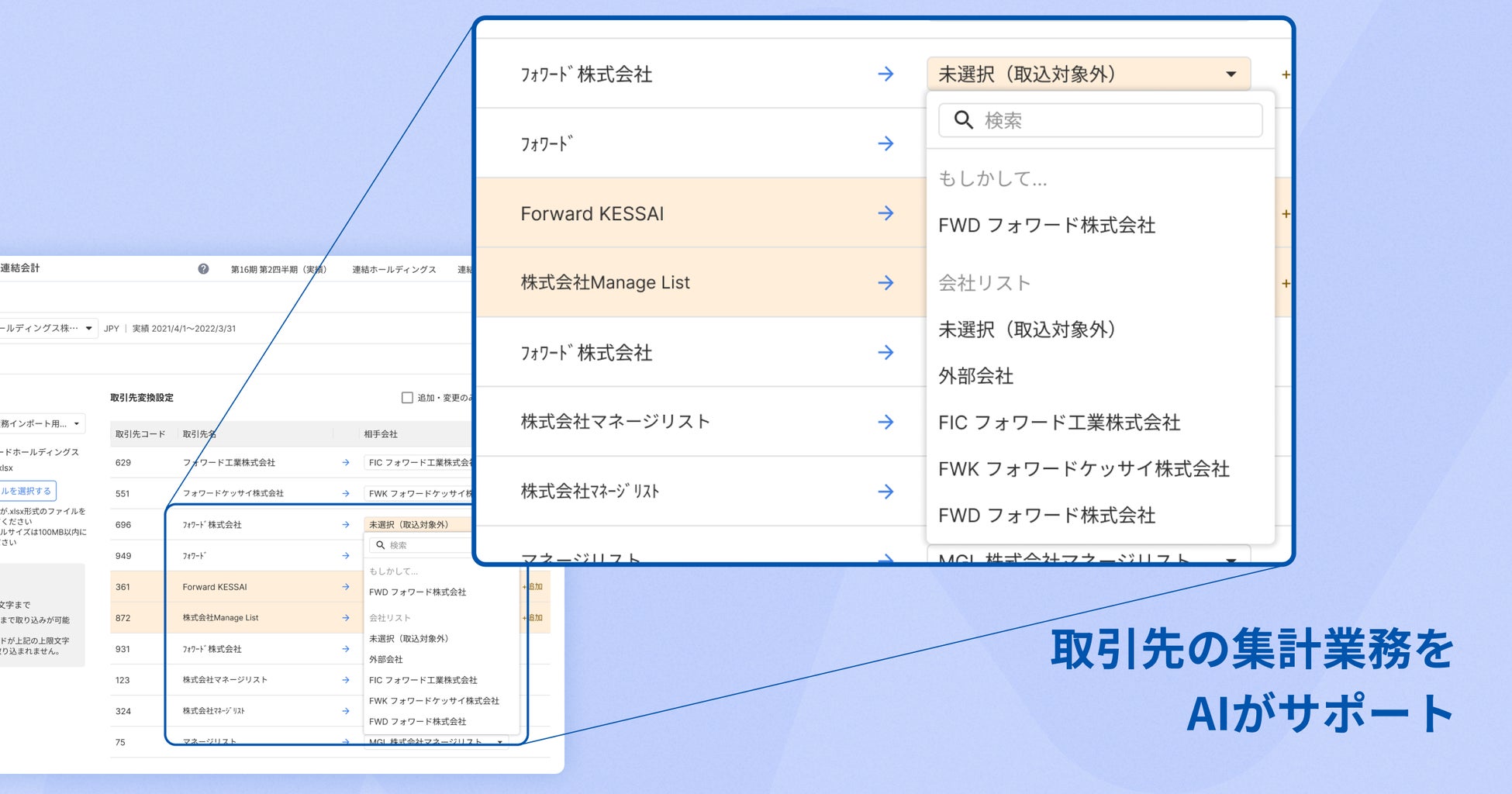 「内部取引の照合・相殺消去」機能は、「内部取引の抽出・サマリー」「内部取引の照合」「消去仕訳の作成」を自動で行う機能です。グループ会社間取引の抽出・サマリーにおいては、OpenAI社のAIサービスを活用した相手会社のサジェスト機能を搭載しています。これにより、ユーザーは煩雑な名寄せ作業をAIの提案に沿って効率的に実施することができます。また、本機能は、『マネーフォワード クラウド連結会計』の標準機能として追加されます※。