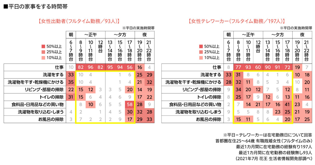 フルタイム勤務の出勤者とテレワーカーで平日の家事をする時間帯を比較すると、通勤や日中の仕事の時間帯(8時~18時台)の中で、テレワーカーは洗濯物を干したり、掃除や買い物をしたりなど、家にいられるメリットを活かして、家事をすることが増えていました。出勤して働いていると早朝と夜遅くに詰め込まざるを得なかった家事がテレワークという新しい働き方によって分散していることがわかります。