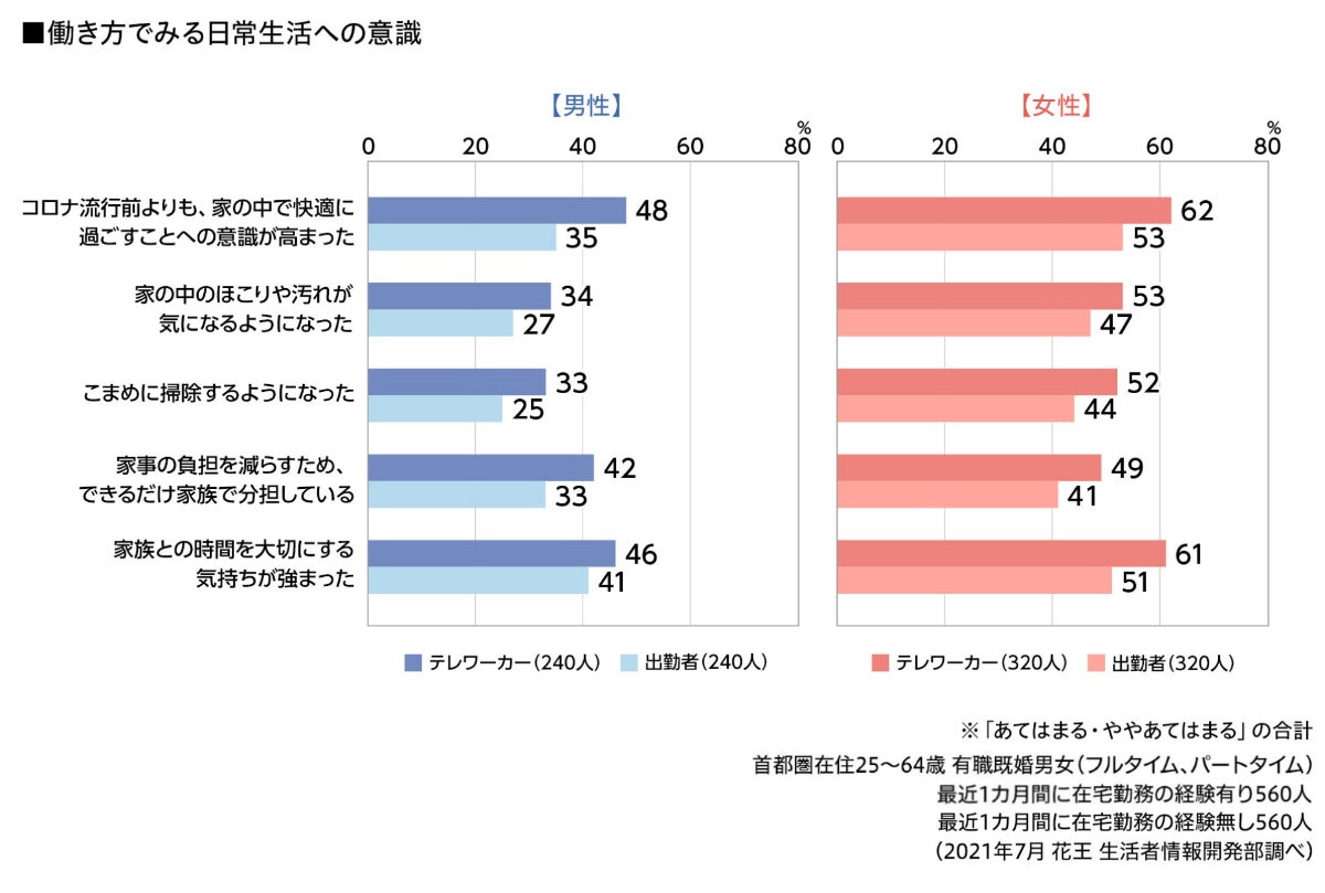 テレワーカーは家で過ごす時間が増えた分、快適に過ごしたいという気持ちが高まっており、出勤をしている人と比較して、こまめな掃除や家事を家族で分担する意識も高くなっています。