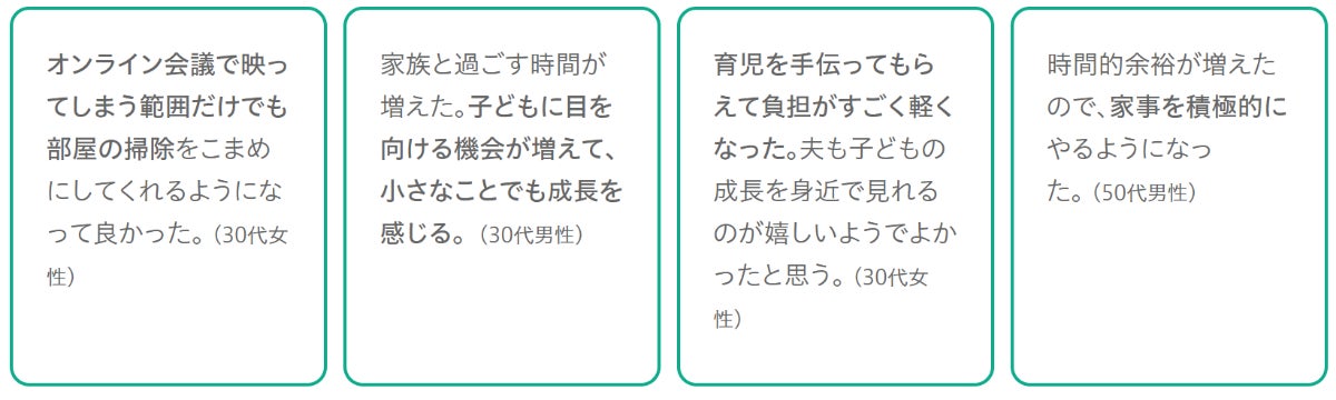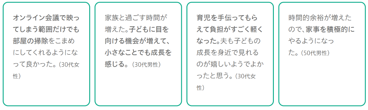 テレワークが一時的なものではなく、働き方の一つとして定着する中で、仕事と家庭生活のありようも変化しています。オンオフの切り替えの難しさを感じながらも、時間の自由度が増すことで、仕事と家事をフレキシブルに行うようになっています。家事で気分転換したり、家族でシェアしやすくなったりすることで、家事に追われるのではなく気持ちに余裕が生まれる様子が伺えました。一方で、在宅が増えたことにより積極的に運動しようという意識も生まれています。