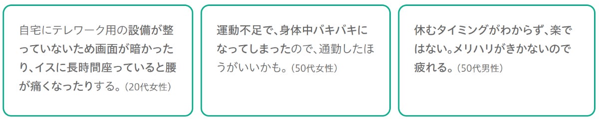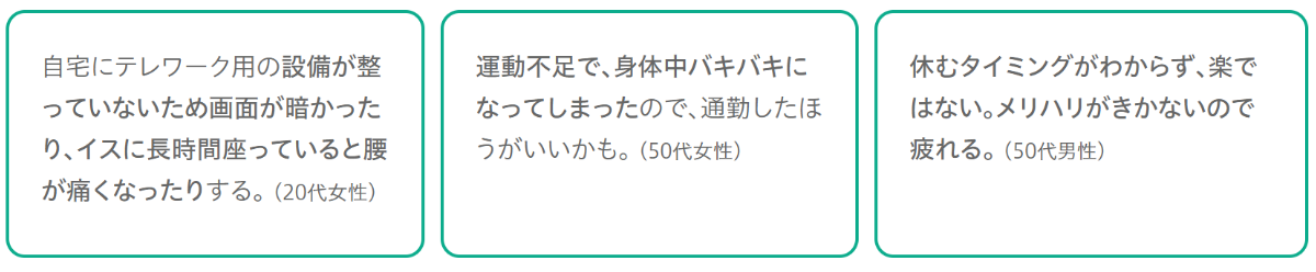 一方で、デメリットはその裏返しとなる内容で、最も回答の多かったデメリットは、家の中に仕事を持ち込むことでのオンオフの切り替えの難しさ(男性47%、女性46%)でした。ついで通勤などの移動がなくなったことによる運動不足。通信費の負担や、ワークスペースなど家の環境が整備されていないこともデメリットに挙げられていました。