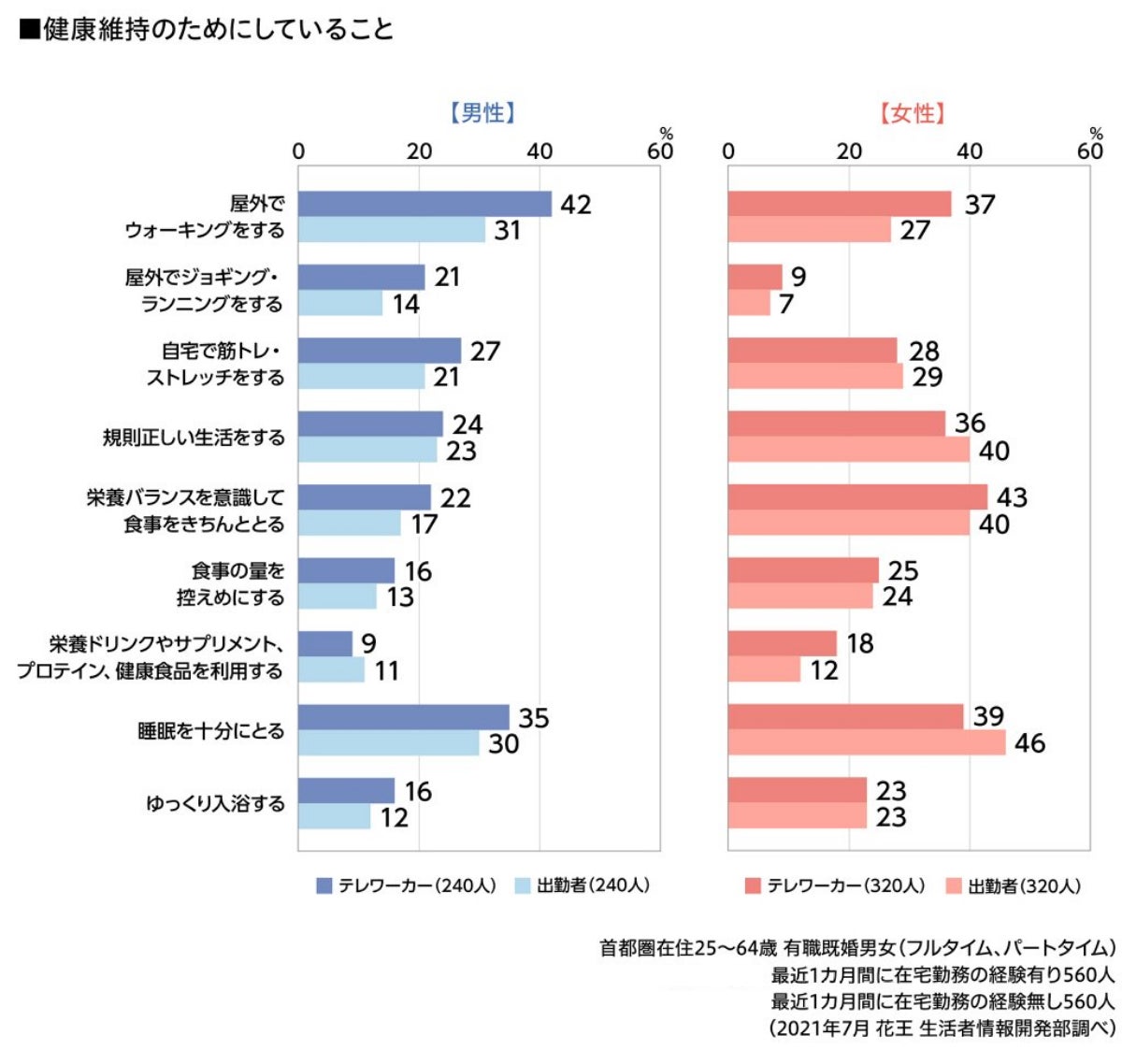 男性テレワーカーは出勤者と比較して、ウォーキング・ジョギング・筋トレなどの運動を意欲的に行っています。他にも睡眠や栄養バランスのとれた食事など、生活を整えようと意識しているようです。女性テレワーカーもウォーキングを行う人は多いですが、サプリメントの利用以外は、出勤者と比べてそれほど差が見られません。男性の方がテレワークによる体調の変化を実感し、前向きに取り組んでいるようです。
