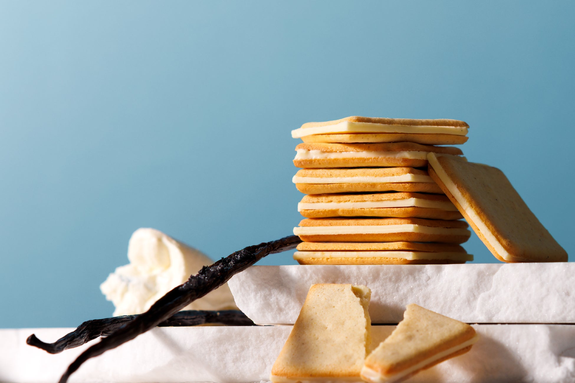 タヒチバニラのエキゾチックで華やかな甘い香りが広がるサクサク食感のクッキーで、マスカルポーネチーズのほのかにミルク感のあるやさしい甘さのチョコ(※)をサンドしました。