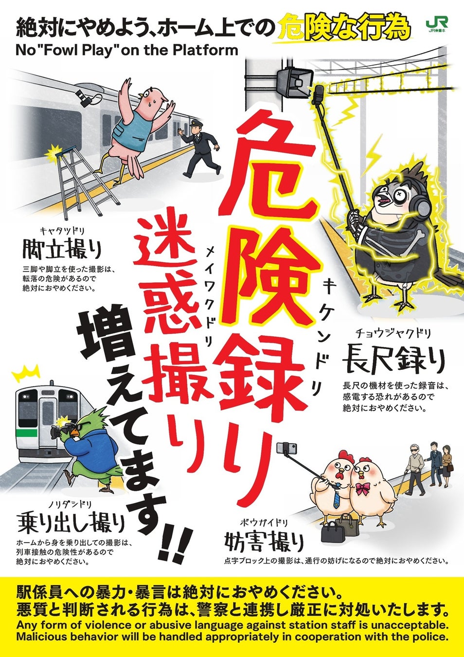 〇JR東日本では、駅のホーム上での危険な行為を防止することを目的として、危険な録音・撮影に関する注意喚起ポスターおよび動画を作成し、駅構内やデジタルサイネージへ掲出いたします。