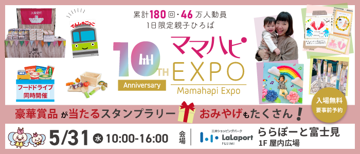 【累計180回、46万人動員の大人気イベント】「ママハピEXPO」がららぽーと富士見にやってくる!豪華賞品の当たるスタンプラリーやおみやげも!家族みんなで楽しもう!