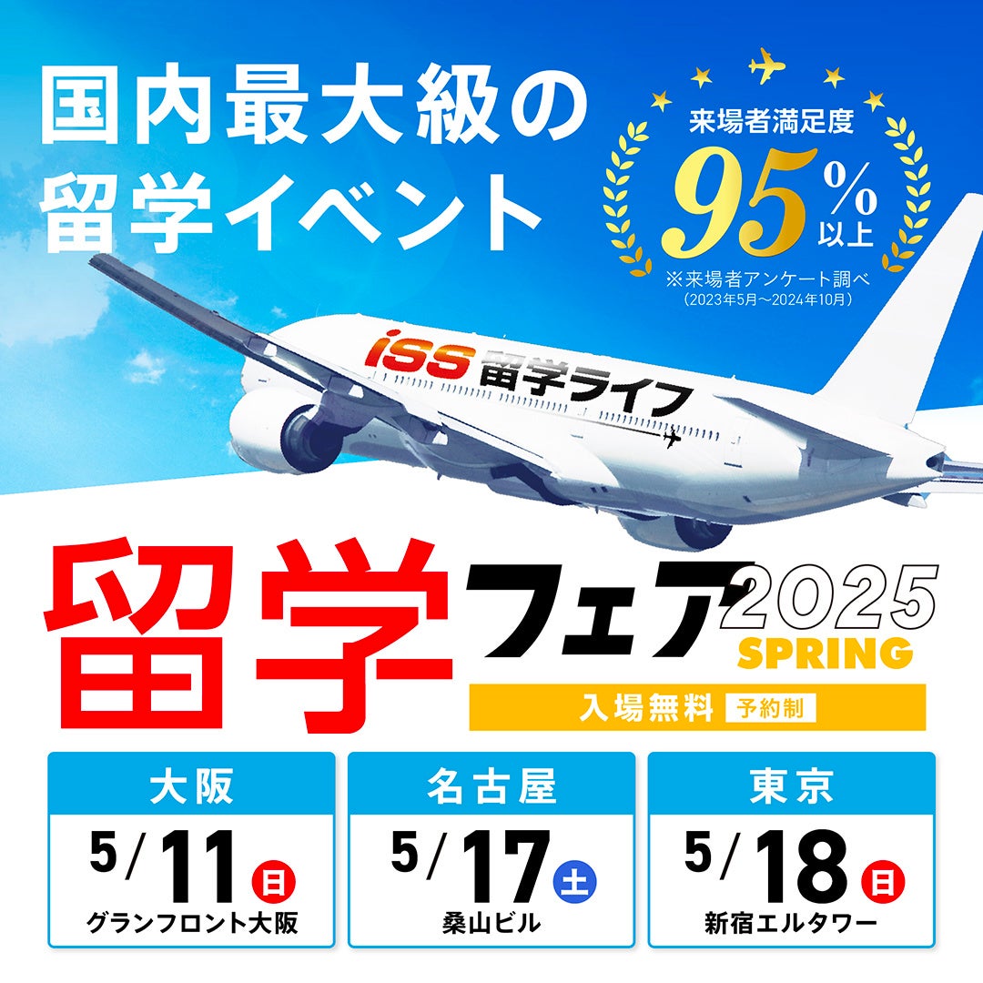 株式会社増進会ホールディングス(Z会グループ)のグループ会社で、留学エージェントの「ISS留学ライフ」(運営会社:株式会社国際交流センター、本社:東京都新宿区、代表取締役社長:石谷雄也)は、2025年5月11日(日)大阪、5月17日(土)名古屋、5月18日(日)東京で、留学フェアを開催します。